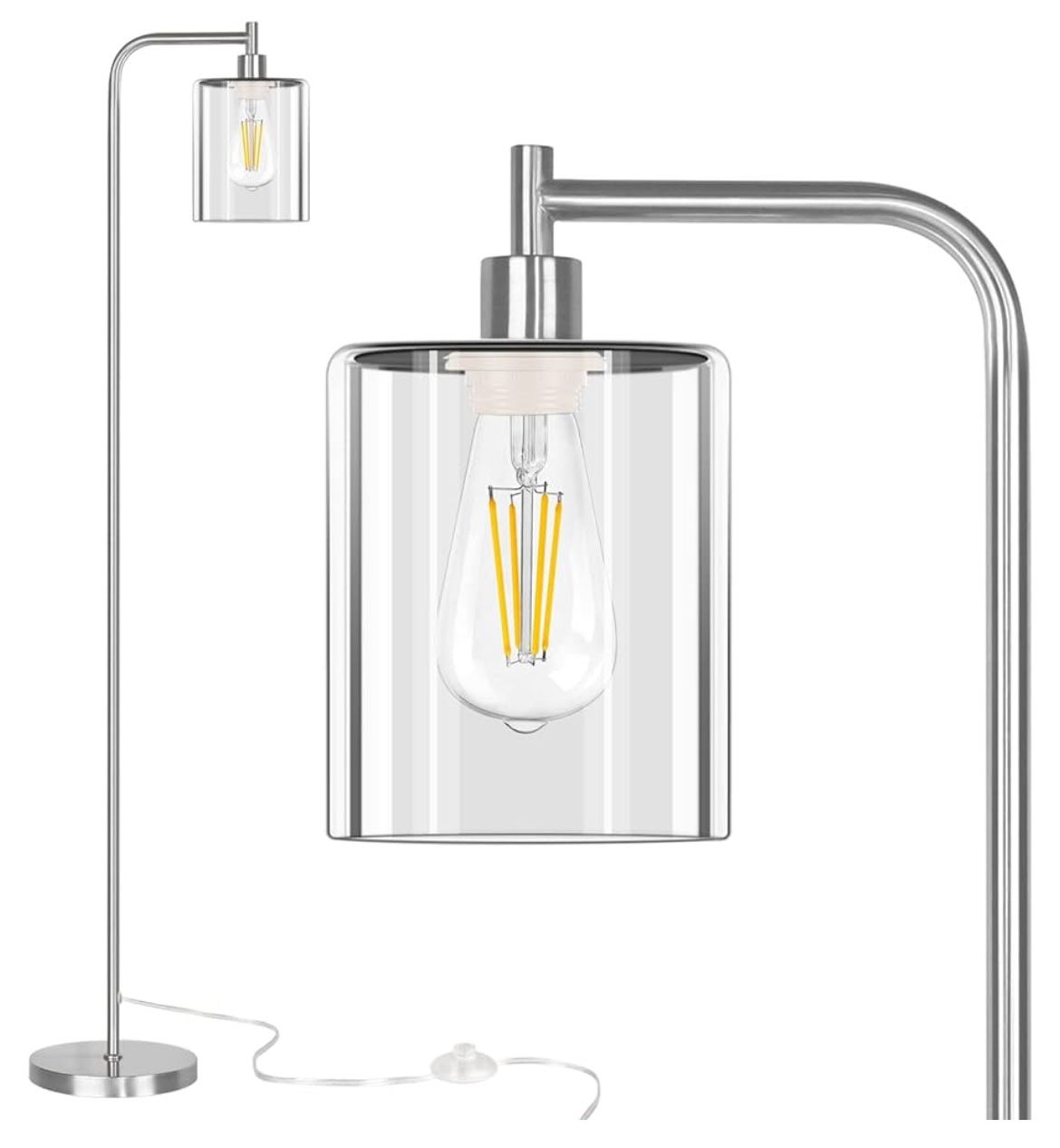 QiMH Industrial Floor Lamp for Living Room, Modern Standing Lamp with HD Glass Lampshade and Pedal Switch, 67” Tall Pole Light for Bedroom Study Room, Brushed Gold (2700K LED Bulb Included)