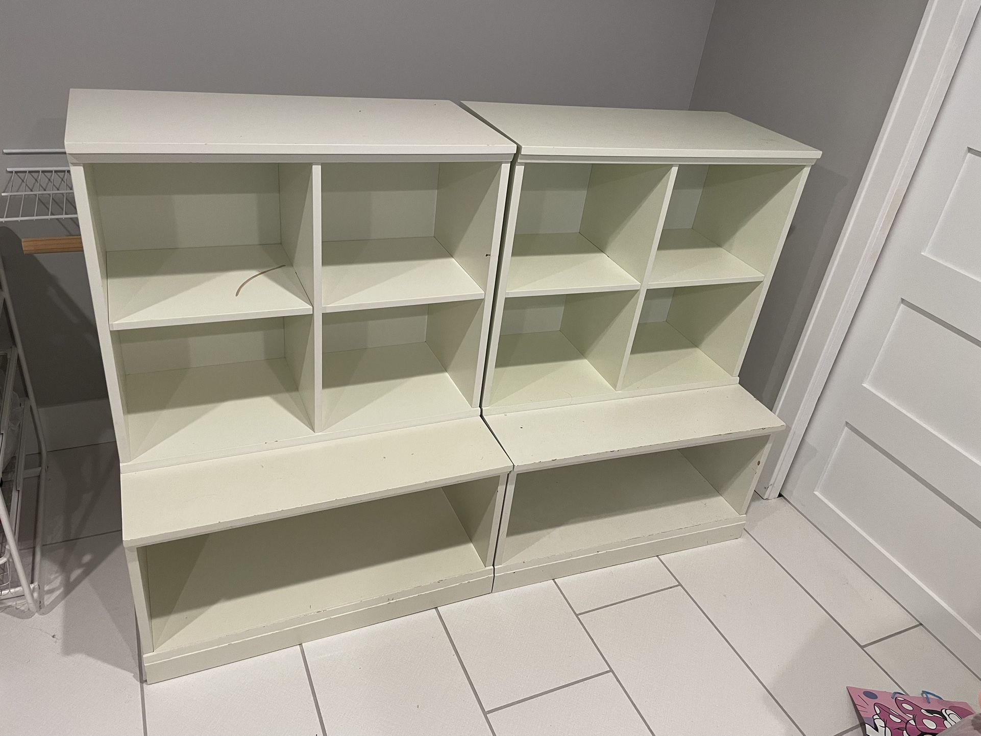 White cubbie cabinets Selling 2 sets of top and bottom. More available if needed. Top 29-1/4” wide x 24-1/2” tall x 14” deep Bottom 29-1/4”wide x 15-1/2” tall x 21” deep