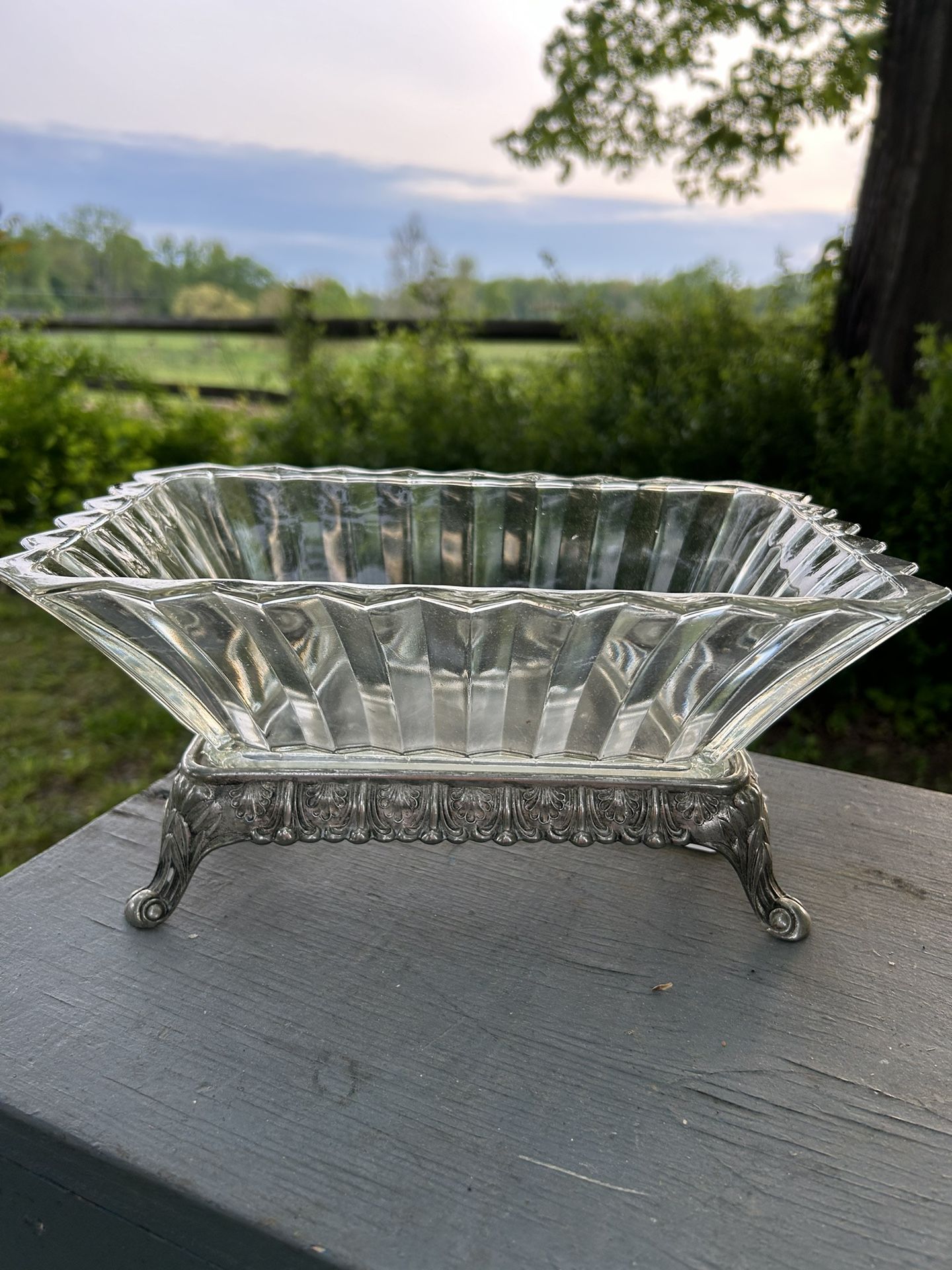 Art Deco Indiana Glass Dish w/Silver Plate Footed Base