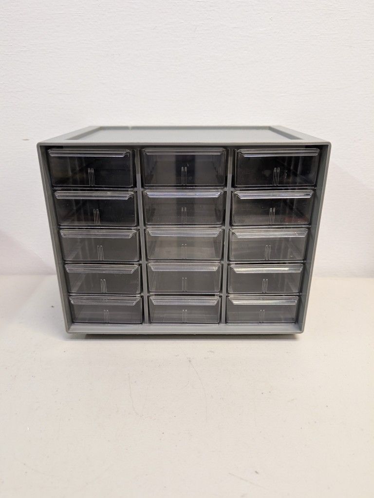 Super useful 15 drawer parts organizer! 9" wide x 6 1/2" deep x 7 1/2" tall. Please check out our other items!