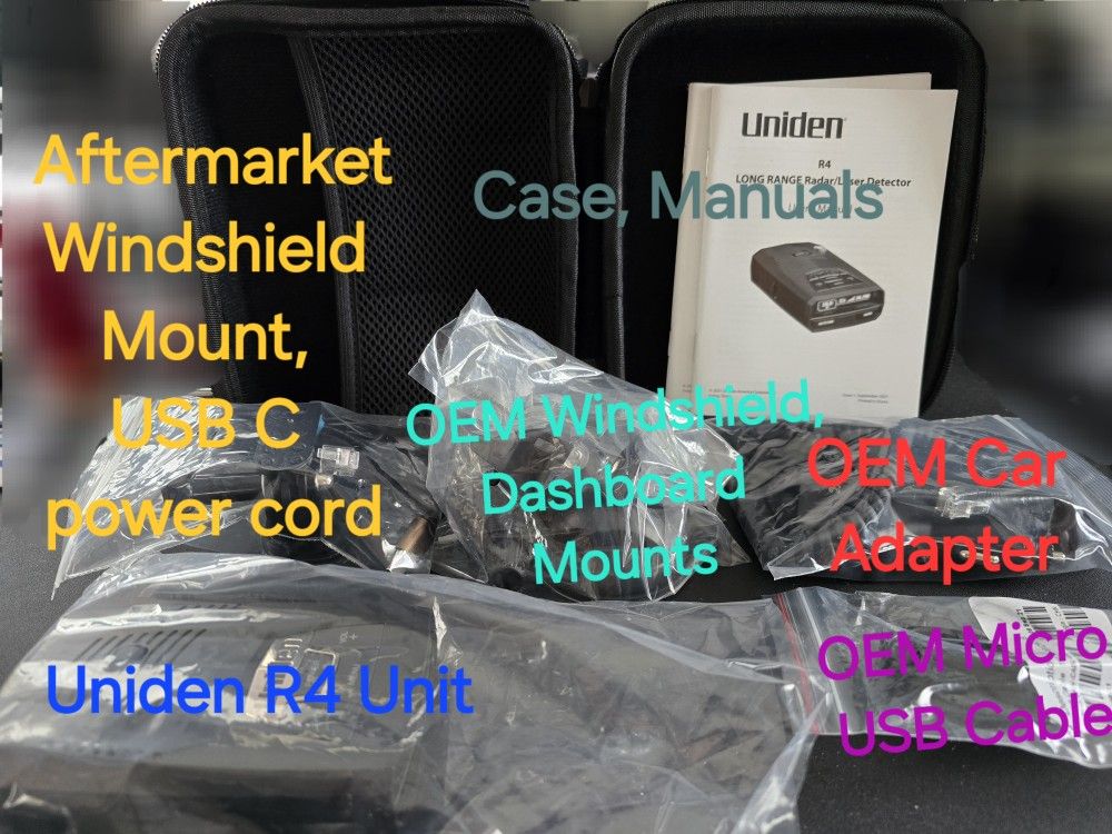Uniden R4 Complete bundle. It comes with everything you need. Works perfect. No longer use it. 1. Uniden R4 Long Range Radar / Laser Detector 2. OEM Windshield Mount 3. OEM Dashboard Mount 4. OEM Car Adapter 5. OEM Micro USB Cable 6. Original Uniden Case and Manuals 7. Aftermarket Windshield Mount ($15.00 retail value) 8. Aftermarket USB C Power Cable ($27.00 retail value) Cash only, local pick up in Norwood.