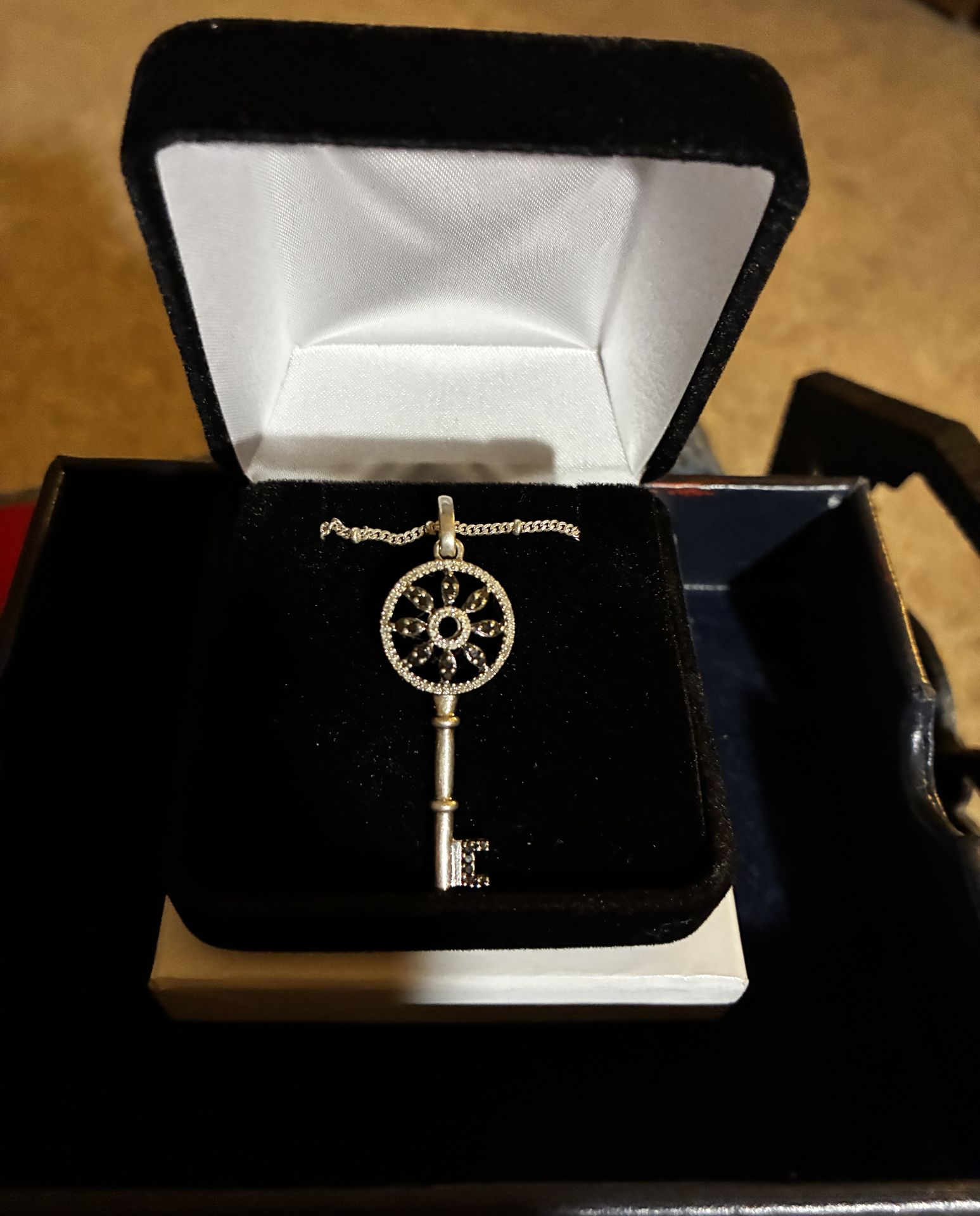 Vintage JWBR .925 silver with black and white diamond skeleton key pendant and 19” silver chain.