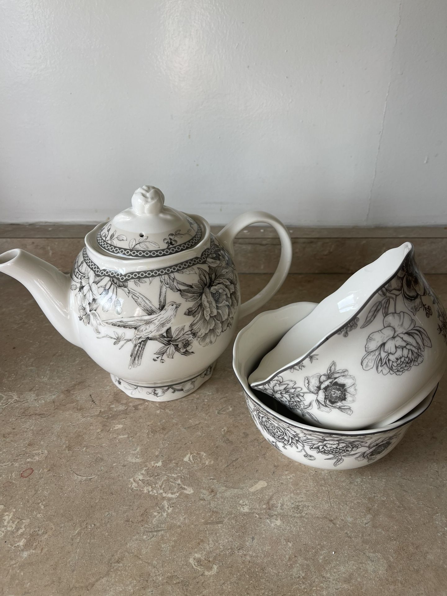 A white teapot with large teacups, in good condition, from Home Goods.