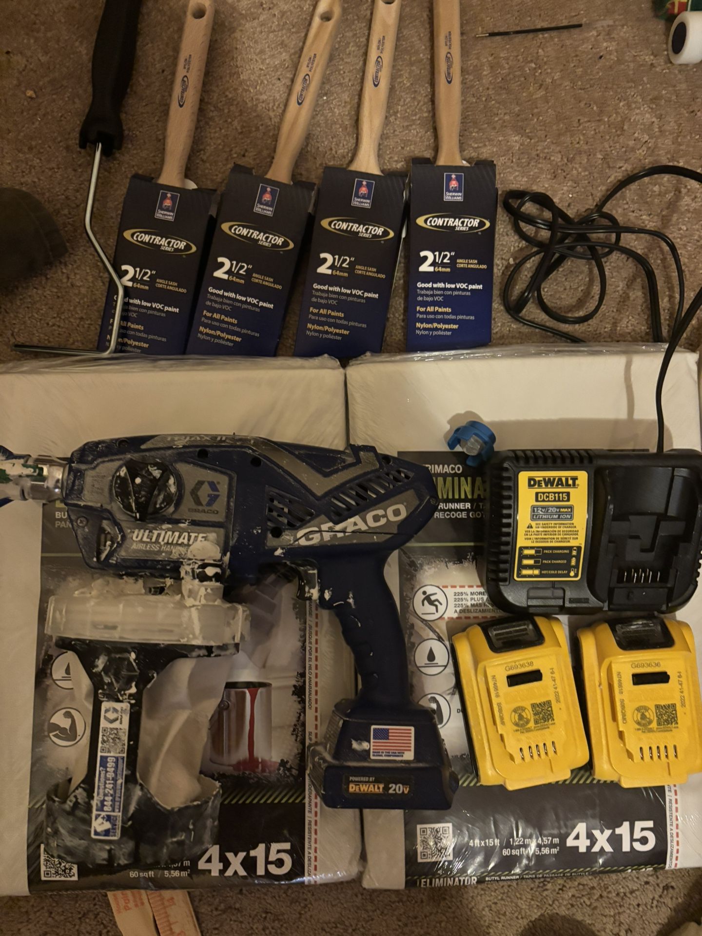 Graco ultimate cordles spray gun w/ extra tip Two 20volt dewalt batteries and battery charger Two 4x15 trimaco eliminator Butyl runners Four 2 1/2 64mm contractor series angle brushes Two 9inch roller frames