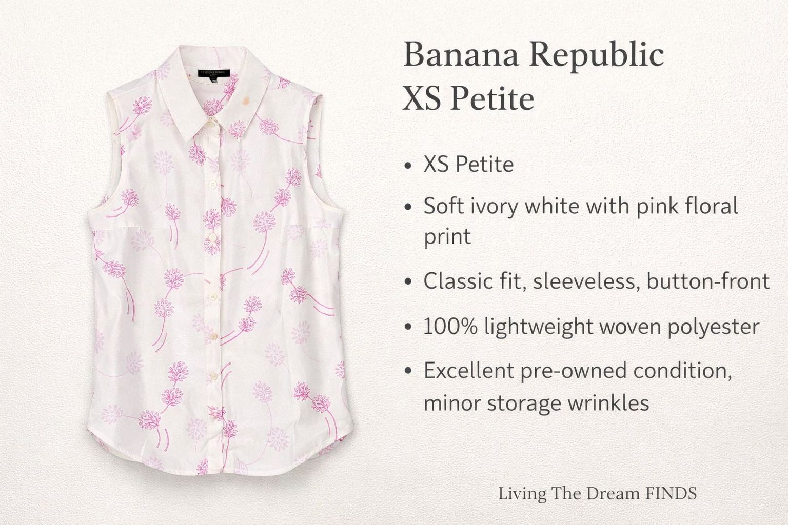 Beautiful Banana Republic Classic Fit sleeveless blouse in XS Petite. This top features a soft ivory white base with a delicate pink floral print throughout. It has a structured collar, full button front closure, and a lightweight woven feel that makes it perfect for layering or wearing on its own during warmer seasons. Great option for work, office wear, or casual everyday styling.