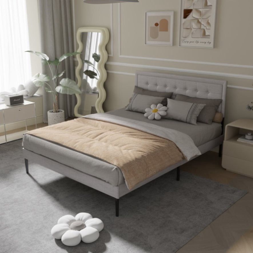 Iron Platform Bed Frame with Wooden slats support & Upholstered Headboard - Grey