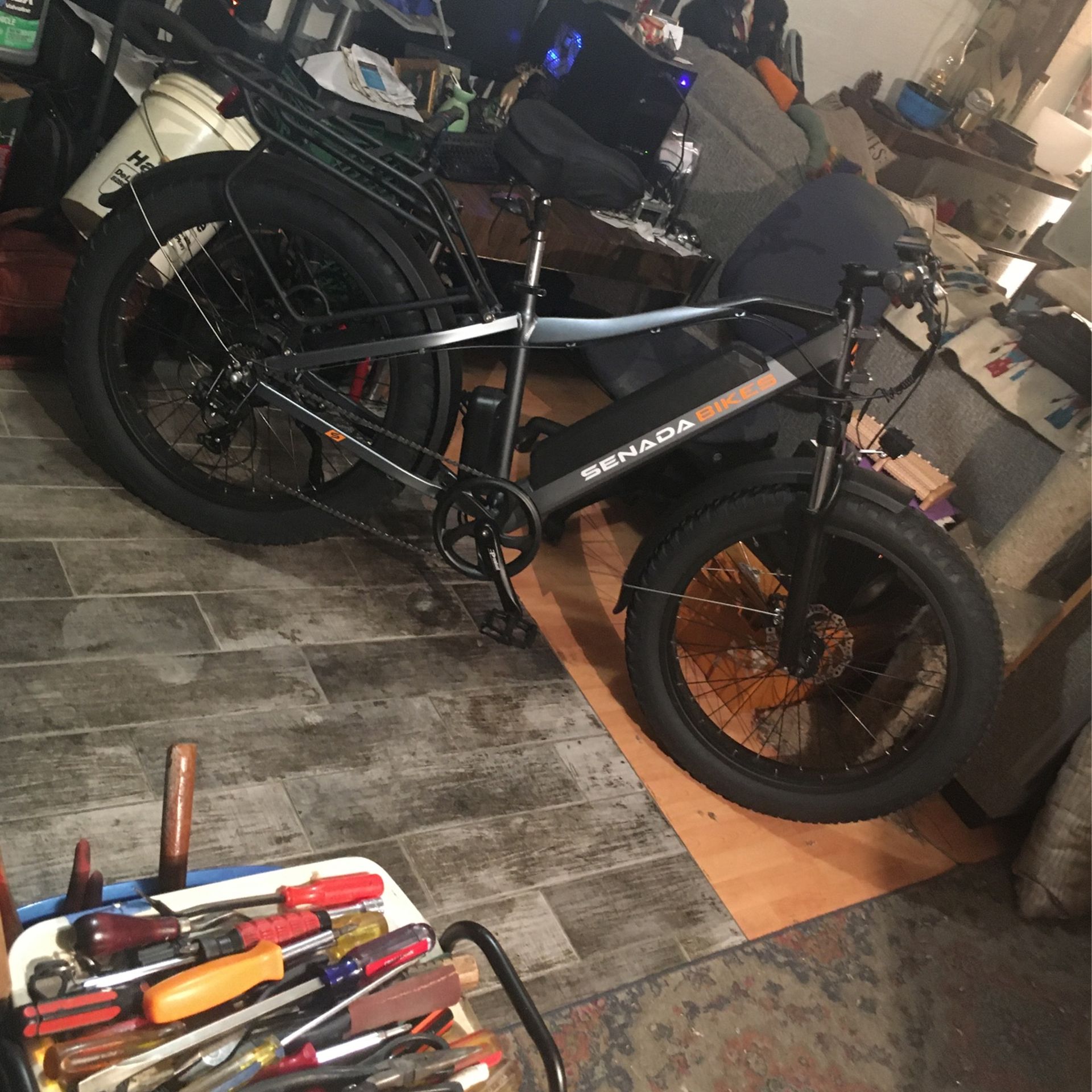 Big sale on right now $750 off retail price New Super Awesome Monster Saber Pro!!! Also right now for a limited time you’ll receive a free bike accessory your choice of a bike lock a phone holder or a cargo bag for your rear rack all worth about $30 each comes with the purchase of any!!! E-Bike for sale, 1850 list!!! This Saber Pro Super E-Bike, is by far the Best deal I have on every level, with crazy 95 Newton meters of wheel spinning torque and 30 plus mph. This is a Hybrid, the Super bike of your dreams and has a 3 inch lower top tube height than a regular top tube and will accommodate most height people and looks very cool!!! This is the Only place in the world where you can get a 1000 watt motor with the crazy 95 Newton meters of torque!!! From setting 1 to 5, as low as 12 mph on #1 and 30 plus mph on #5, others bikes 16 to 25 mph for same price!!! 65 mile range and depends on whether U peddle and or use peddle assist or not, 48 volt lithium ion battery with 15amp hrs run time about 60 miles range. Super torque 1000 Watt, monster motor w/95 Newton meters of super torque in this brushless motor, others are 500, 750 watt, and half the torque, poor them!!! Gunmetal Grey with Black highlights! Front fork with lockout, Huge 180mm disc brakes, 7 speed Shimano shifter and durrailure. Big soft seat, 26 by 4 inch knobbies, integrated led front light , tail light long fenders, Big and much better stopping with Huge 180mm Disc that stop on a dime etc etc . So much on it can't list it all!!! This is selling for 1,200 and a steal so Message me and I will get back to you asap and thanks for looking! Oh yeah come by for a demo ride for free, as many as you want!!! 2 year warranty from Senada ebikes on everything but battery that is one year and I Handle all for you and the industry Leading 3!Years of free adjusting, tuning if needed anytime from me. Although these are tanks and never seen one with issues yet but I am here if you need anything. No one else offers this kind of protection at any price, period!!! Oh yeah, can make any old bike {or new} into a awesome custom E-Bike with any amount of power and distance you want, it all depends on how much money you want to spend!!! Have fun be free and own the streets!!! Maybe slow to respond as do this on a computer but check off and on day and night so thx for your patience! Just message me to come see and ride this monster!!! Thx soooooo much for looking and hope to see you soon, Dana. Do yourself a favor and do research so you don’t offer half of the full value and look Stupid!!!!! No Lowball offers, Stupid Low offers will be deleted!!!