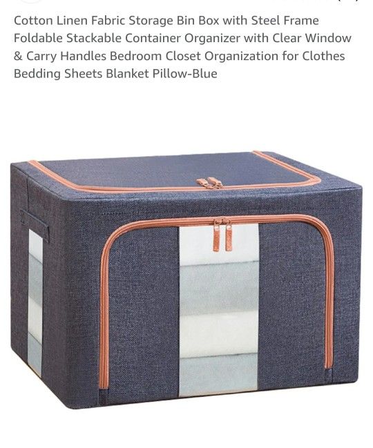 Cotton Linen Fabric Storage Bin Box with Steel Frame Foldable Stackable Container Organizer with Clear Window & Carry Handles Bedroom Closet Organization for Clothes Bedding Sheets Blanket Pillow-Blue