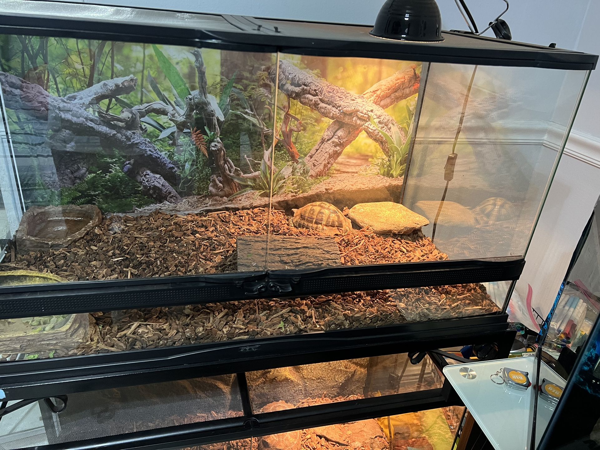 Size 36x18x18. Great condition. The Hide, Bowls, Light, & Background are also included. The Stand is not included. Tank may be used for bearded dragons, tortoises, lizards, snakes, etc.