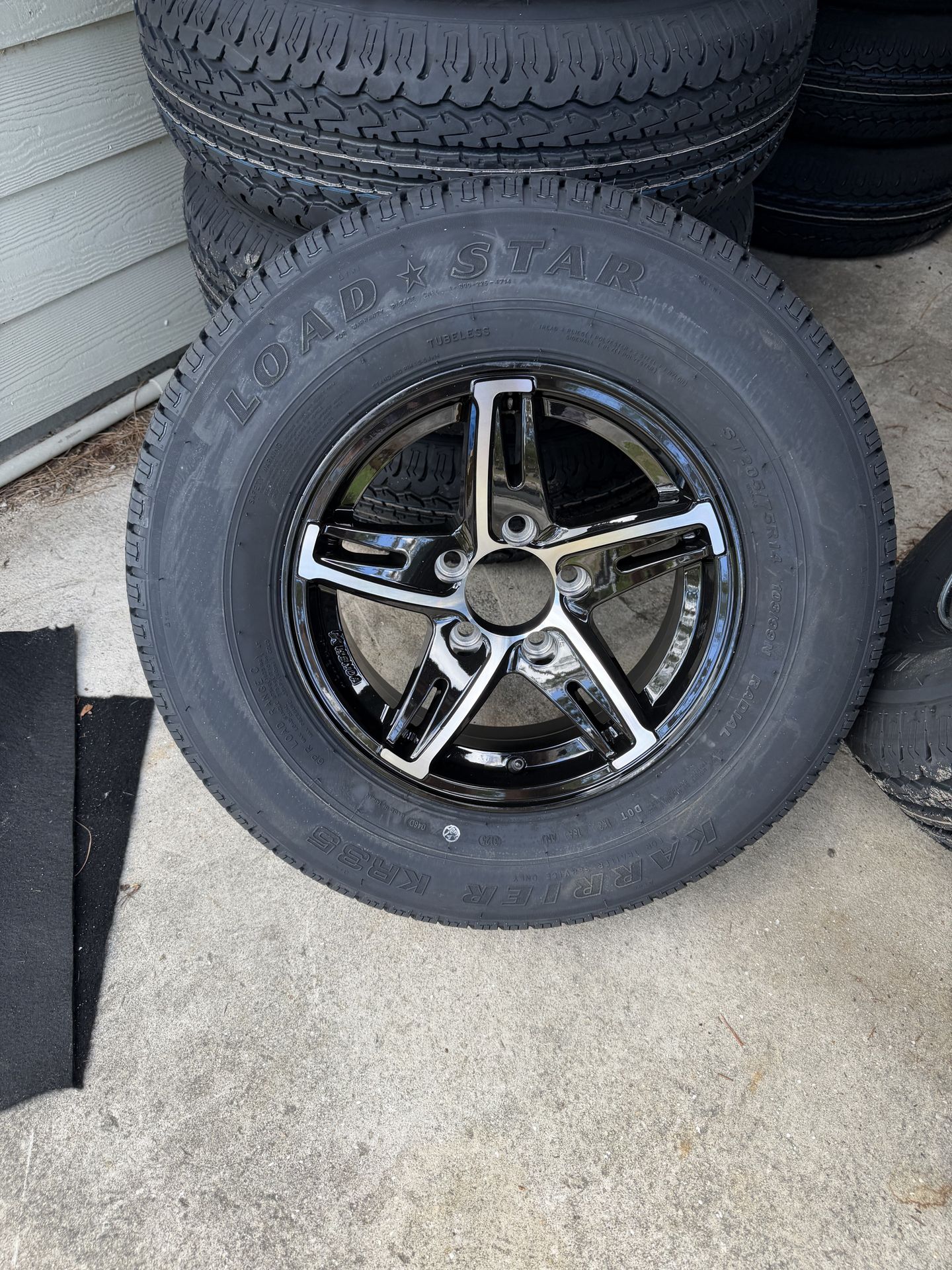 New 205-75-14inch trailer tires with black aluminum wheels. In stock.
