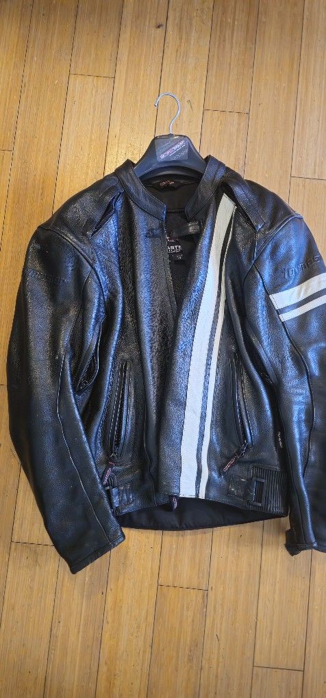 60.00 Leather motorcycle riding jacket. Good condition and no issues. Comes with shoulder, arm, and back padding. Size large. Keywords Motor Cycle Bike Scooter Leather Jacket Cover