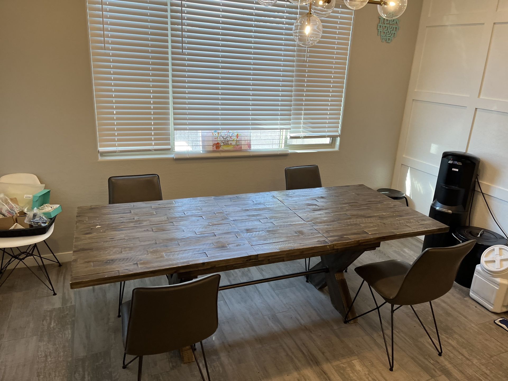 Dining room table with leaf extension, 5 years old. Bought at Living Spaces. Length 75”-94.5” Width 39” (Chairs not included)
