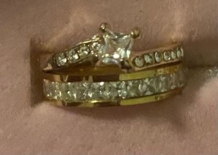 Beautiful 925 Sterling Silver 14Kt Gold Overlay Princess Cut White Sapphire EngagementRing Set On Top Of A Beautiful Titanium WeddingBand. Brand New. Size 4.14-4.5 Wedding Ring 2 Piece BridalSet Absolutely Stunning!!!