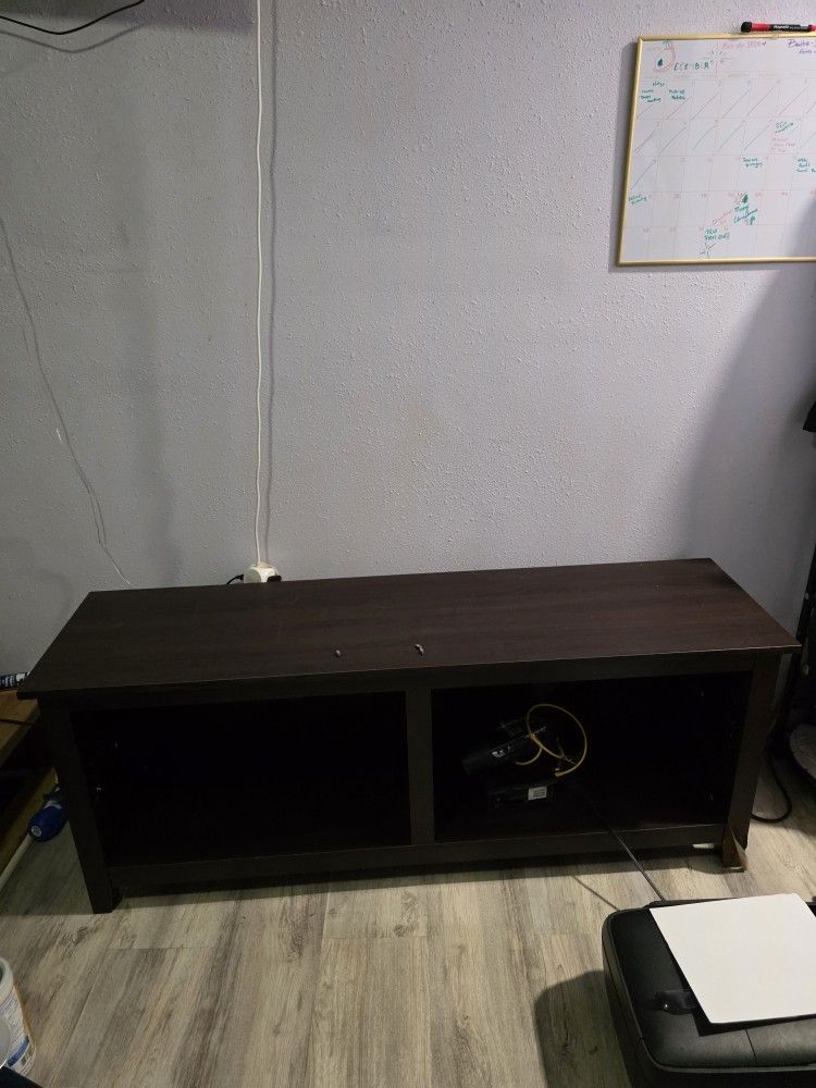 Wood/ wood composite. Width 58.2 inches, 15.9 inches, height 23.5 inches. Cleaning out room. One leg has peeled skin. Purchased from Walmart. $30 OBO