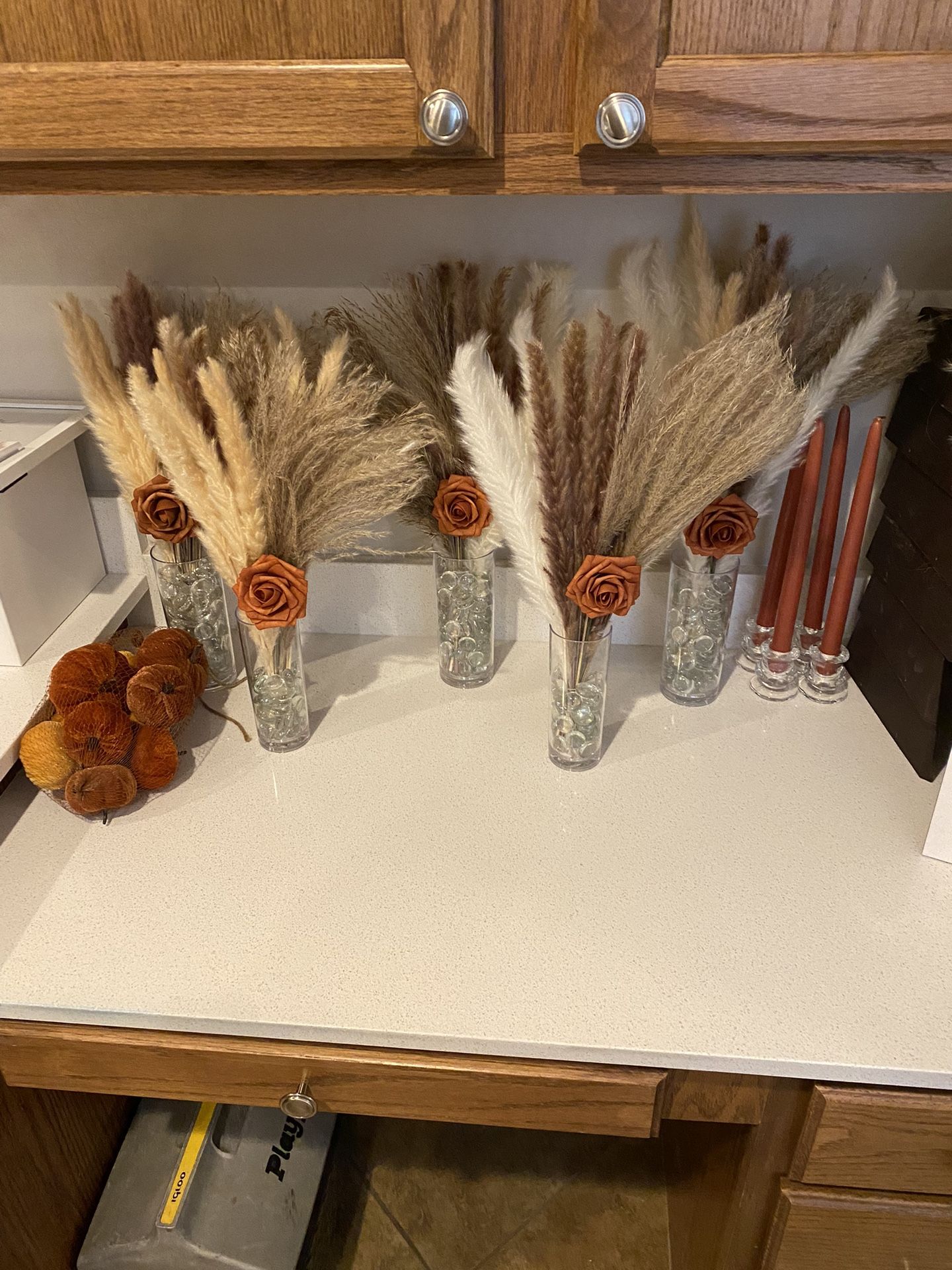 5 pampas centerpieces Diaper raffle sign Diaper raffle name cards Diaper raffle box 2 nude table runners Oh baby sign 8 terrocata candle sticks with candle holders