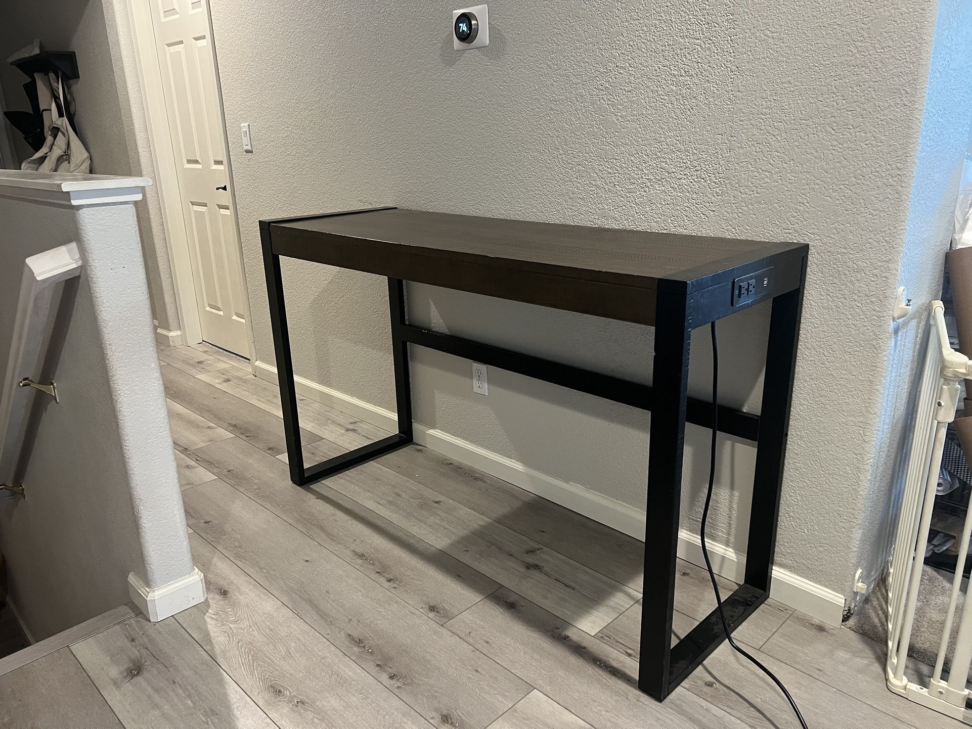 I bought this rustic table to go behind my couch in our media room. It has usb and plug connections, it was great for my laptop or other electronic devices. L- 60” D- 20” H-36”