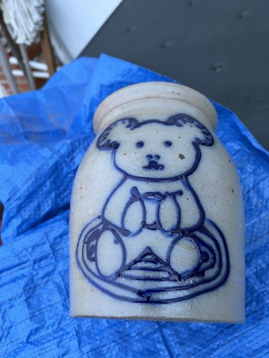 7 1/2 inches tall and 5 inches in diameter This stoneware crock is a vintage piece from Beaumont Brothers Pottery (BBP). Known for its primitive, salt-glazed style, this specific design features a hand-decorated cobalt blue teddy bear motif. Product Details Manufacturer: Beaumont Brothers Pottery (BBP). The pottery was produced in various locations, including York, Maine, and Texas. Material: Salt-glazed stoneware with cobalt blue slip decoration. Function: These durable crocks are often used as kitchen storage, utensil holders, or as rustic farmhouse decor. Markings: Authentic pieces are typically stamped or incised on the bottom with "BBP" and the year of manufacture (e.g., 1994, 1996, or 1998). Market Value Based on recent listings, similar BBP teddy bear crocks are valued between $30 and $60, depending on the size and specific year of production.