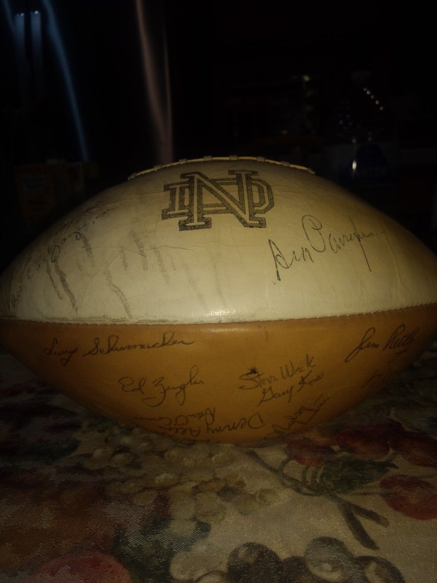 From the 1968 Fighting Irish coached by the legendary Ara Parseghian. Other signatures include ND legend Ed "Moose" Krause, Rev Joyce, Joe Theissman, Mike McCoy, Larry Dinardo, Coley O'Brian and others. If interested please make a reasonable offer! Key word reasonable I will not respond to "is this still available" If it's here it's still available