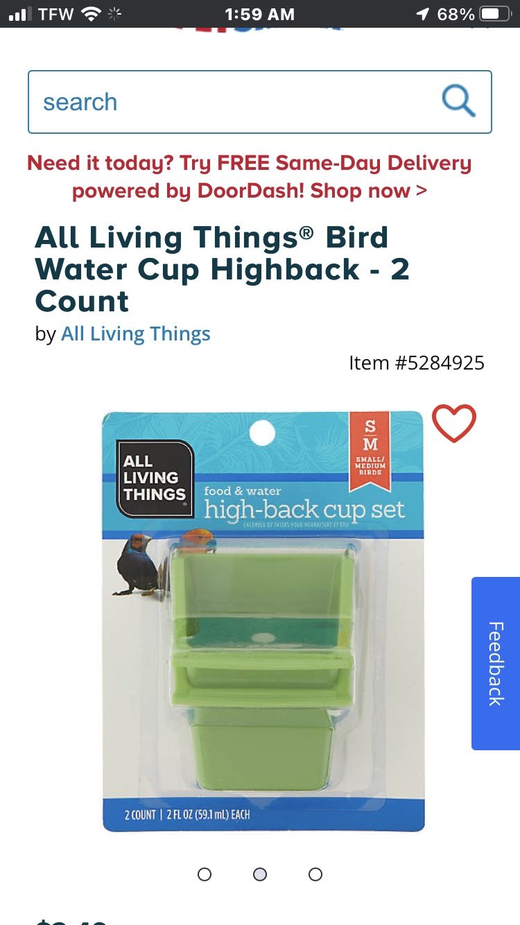NEW All Living Things® Bird Water Cup Highback - 2 Count Provides a convenient place for your bird to access food and water with this All Living Things Food & Water High-Back Cup Set. These cups each feature a perch and are designed with a high back, which keeps your bird's home cleaner by reducing the overflow and scattering of seeds. Features: High back helps reduce seed overflow and scattering Provides a convenient built-in perch Easy to hang in all types of wire cages Includes: 2 Count Intended Pet(s): Small/Medium Birds Product Dimensions: 2.5 in x 3 in x 2 ¾ in Capacity: 2 fl oz (59.1 mL) each ***Pick up available*** **Check out my other listings**