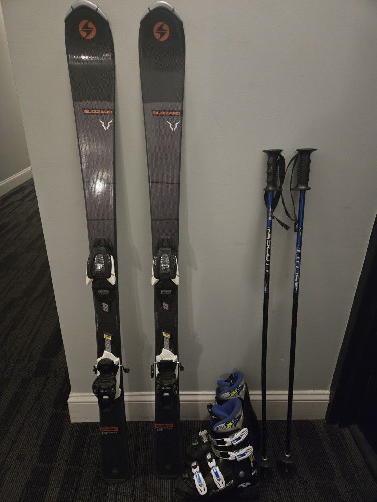 130cm Blizzard skis, 22.5 boots, poles included. Located in Wood Dale.