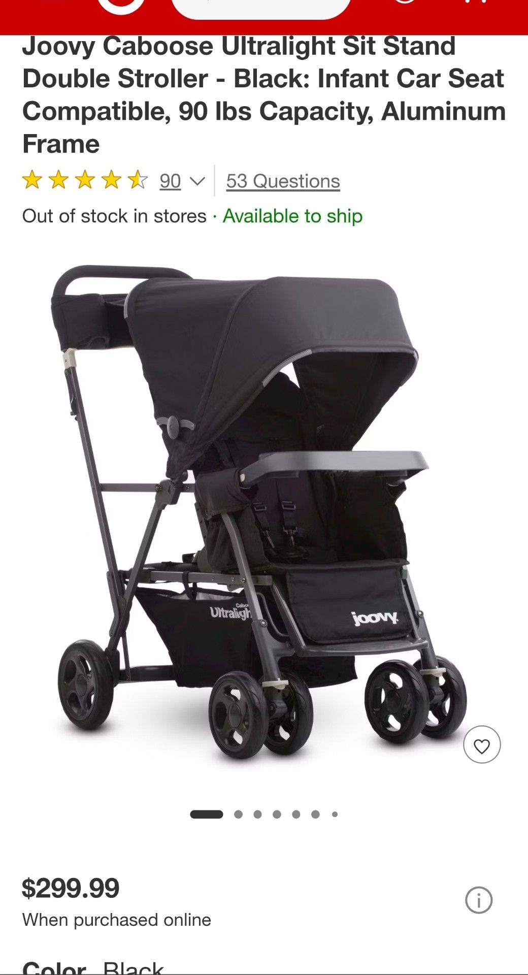 This is the Joovy Caboose Ultralight sit stand double stroller. Compatible with infnat carseat and has straps to secure it. Basket underneath is spacious, baby seat has multiple recline positions & harness, and seat for toddler can be moved back & forth too. Sold as is. In Used condition and weather worn. Tires are good and brakes work. If I can find the child tray or parent organizer, I will include them.
