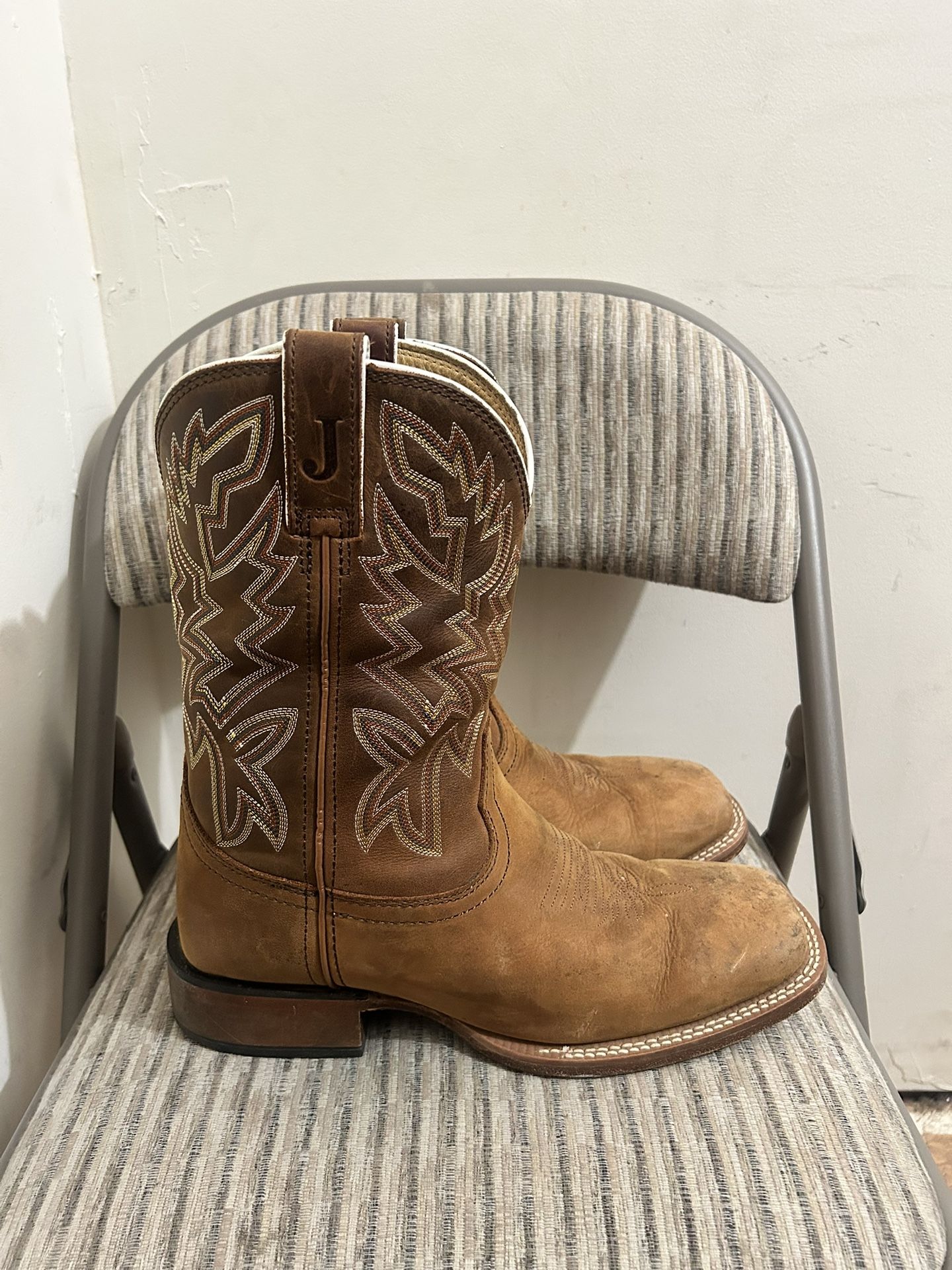 SIZE 9 1/2 HAD FOR A YEAR BUT DONT FIT ME NO MORE LETTING GO FOR CHEAP SINCE THEY NEED A CLEANING FROM BOOT BARN PAID 240 ASKING FOR 120
