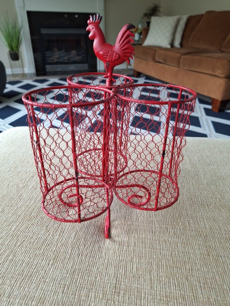 Pictures are the best description Red Metal Rooster Utensil Holder Basket Center Display Red metal fork spoon and knife holder Chicken wire basket that turns Overall height is 10 inches Width is 7 inches Each basket inside diameter is 3 1/4 inches and 5 inches deep