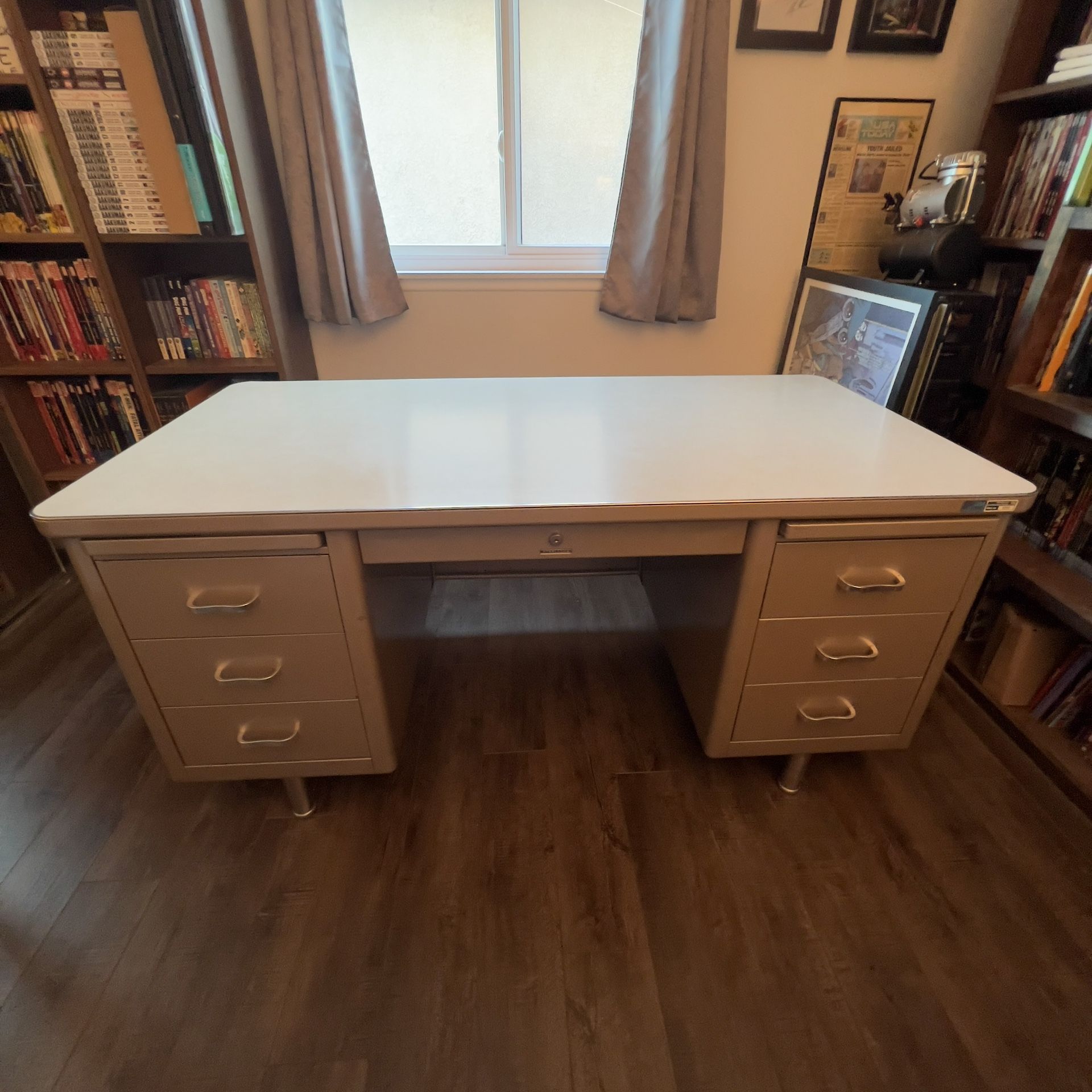 CASH ONLY LOCAL PICK UP ONLY – RANCHO SANTA MARGARITA Vintage Steelcase tanker desk. Heavy-duty all metal construction with original light gray finish and laminate top. Multiple deep drawers plus locking center drawer. Every drawer works with smooth action and all drawer wheels are intact. Legs and drawers can be completely removed for easier transport. Very solid and far sturdier than modern desks. Great condition for its age. These typically sell for $600–$900 depending on condition. Selling due to space/move. Bring help — it’s heavy. It has a twin if you’re interested.