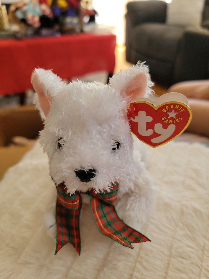Ty Beanie Baby Kirby the White Dog with Plaid Scarf! ( 5.5 inch)