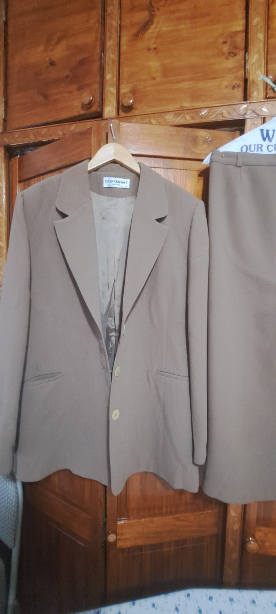 Quality women’s suit set from BASCOMPANY. Includes a classic taupe blazer (3-button closure, fully lined) and matching midi pencil skirt (back vent, fully lined). Italian size 52 (fits like US women’s 20). Material: 70% polyester, 30% viscose. Made in Italy. Both pieces are clean, sharp, and ready to wear—ideal for business, interviews, or formal events.