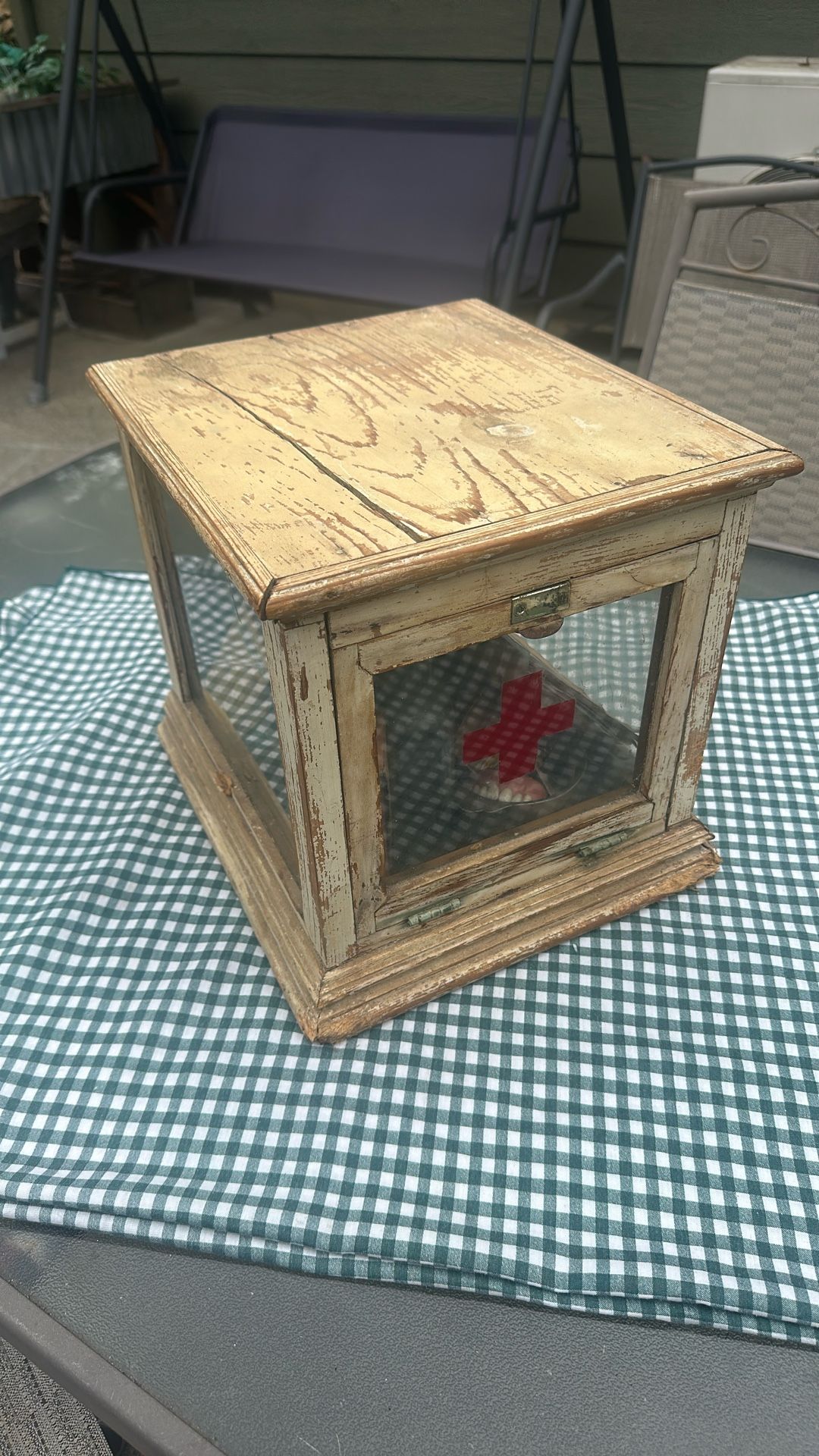 Rustic Handmade First Aid Kit with assortment of old bottles of medicines, false teeth, booklets, etc. Very unique. Box is 12” x 12” x 12” I paid $100 for it, Asking $75.00