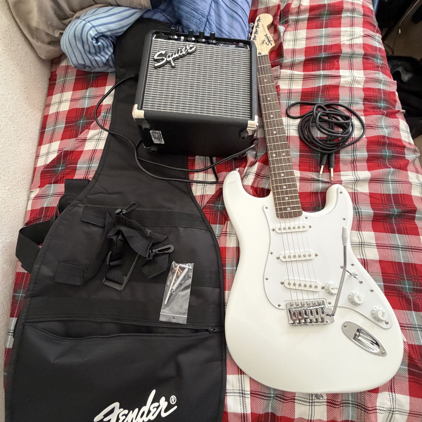 It comes with every you need to start playing i have the guitar strap and bag strap it comes with picks the amp, i got it because i wanted to learn but never did its brand new used a couple times let me know if you wanna see more photos!