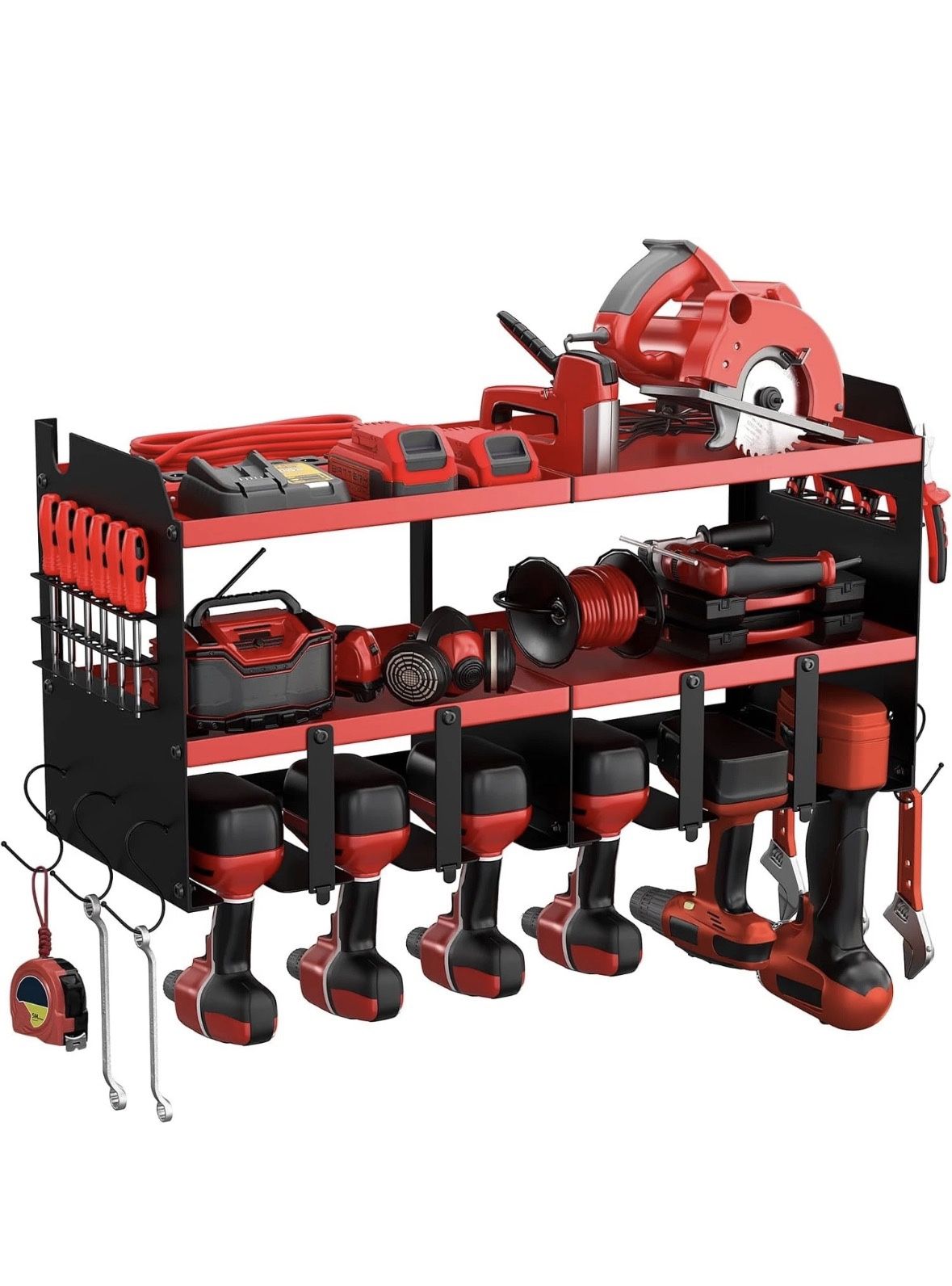 NEW Power Tool Organizer Wall Mount w 6 Drill Holders, Heavy Duty Metal Black Red Power Tool Organizer Wall Mount with 6 Drill Holders, Heavy Duty Metal Power Tool Storage Rack with Top Shelf & Side Hooks, Wall Mounted Tool Shelf for Garage Workshop, No Charging Station Asking $40 or best offer. Local pick up Gwinnett Heavy-Duty All-Metal Construction- Built from thickened cold-rolled steel with a powder-coated finish, this wall-mounted tool organizer is rust-resistant and ultra-durable, capable of holding up to 150 lbsperfect for heavy cordless drills and power tools. 6 Drill Holders & Large Top Shelf- Features 6 slots designed to securely store cordless drills and impact drivers. The wide top shelf provides ample space for batteries, chargers (not powered), toolboxes, or other frequently used tools. Multi-Tool Compatibility & Efficient Layout- Includes side hooks and slots for hanging screwdrivers, pliers, hammers, and more. Keep all your tools visible, accessible, and neatly arranged for a streamlined workflow in any garage or workshop. Space-Saving Wall Mount Design- Mounts easily to any wall or pegboard using included hardware. Frees up floor space and transforms cluttered garages or tool sheds into clean, organized workspaces.