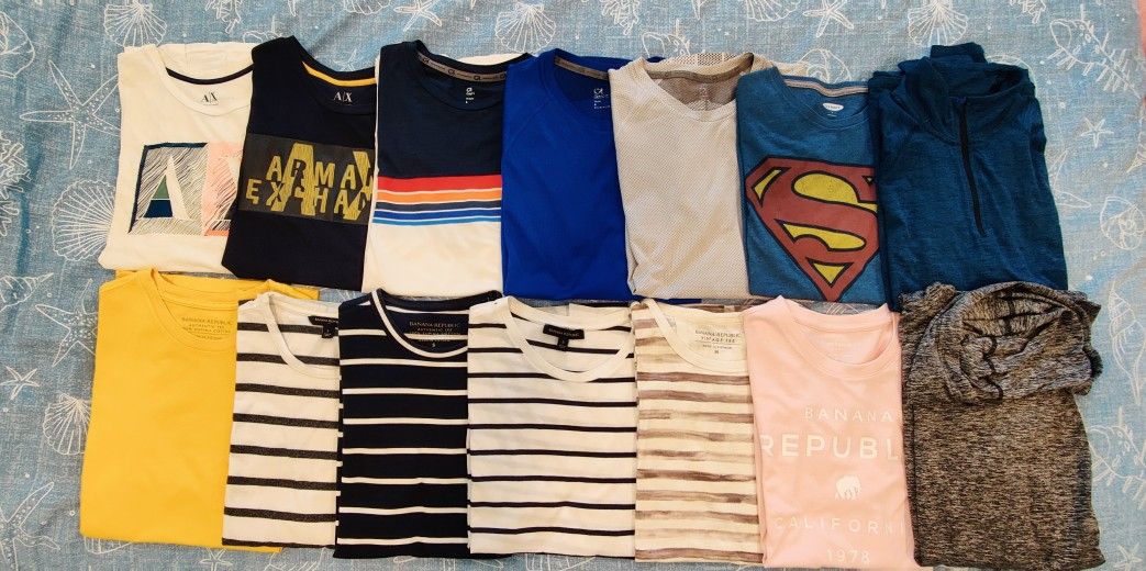 Nice collection of T-shirts Mostly men size small Worn by Non-smoker, all shirts are well taken care of, always line dried, non bleach, fragrance free detergent used. You will get everything you see, mostly short sleeves and 2 long sleeves Gap Fit shirt (one gray jersey hoodie) Buy these now before the price of clothing go up due to tariff. Price Firm Retail for $300+ Pick up in Covina