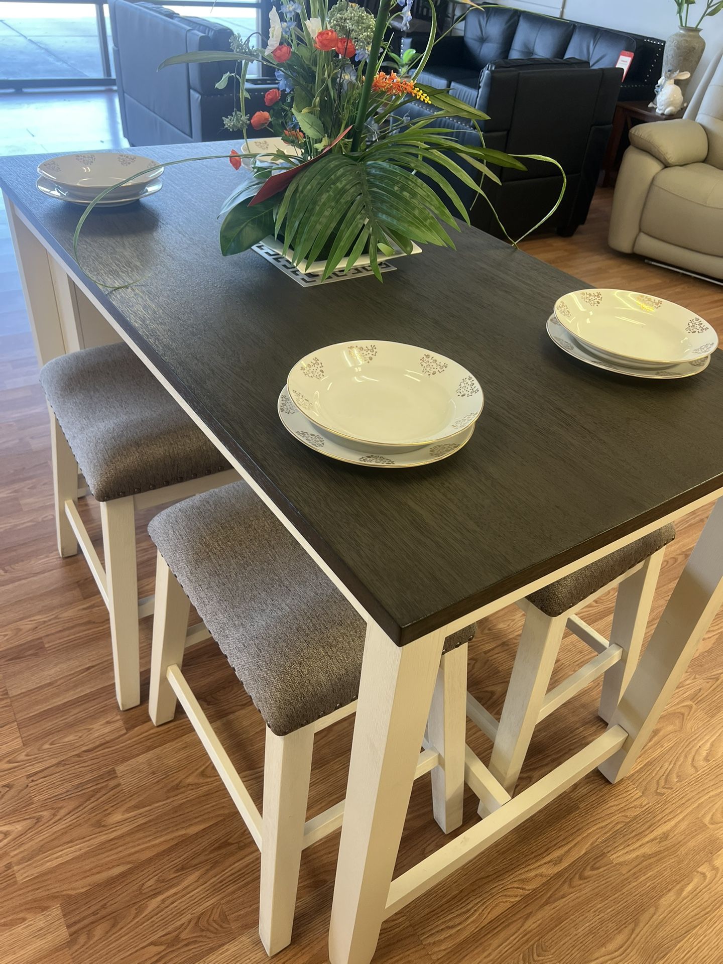 Wood top dining table with cushion bar stools