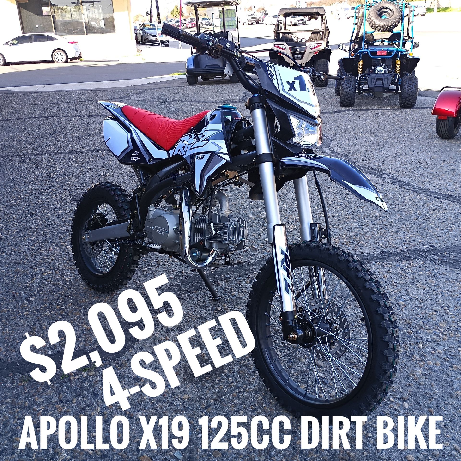 Apollo x19 4 speed kick and electric start dirt bike $2,095 cash price plus taxes and fees Looking for the perfect blend of power, agility, and "wow" factor? Meet the DB-X19 125cc—the dirt bike built for those who don’t just follow the trail, but own it. Whether you're hitting the tracks at noon or tearing up the trails at dusk, the DB-X19 is ready. With integrated Headlights and a Heavy Duty Steel Twin-Spare Frame, this bike is as tough as it looks. 🛠️ Why the DB-X19? Raw Power: 125cc 4-stroke engine delivering a punchy 6.0\text{KW} at 7500\text{r/min}. Total Control: 4-speed manual clutch for riders who want to feel every gear. Superior Stopping: Front and rear hydraulic disc brakes for precision safety. Easy Start: Never get stuck. Features both Electric and Kick Start options. Pro Stance: 17" front and 14" rear wheels with a comfortable 34" seat height. Clovis Motorsports 3777 n Clovis ave 93727 Open Monday through Saturday 10:00 a.m. to 6:00 p.m.
