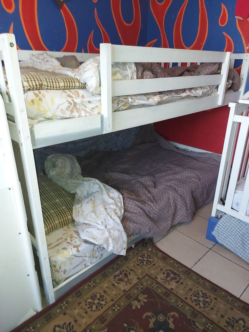 White twin bunk bed no mattresses with stairs and slide. Selling for $120 or best offer.