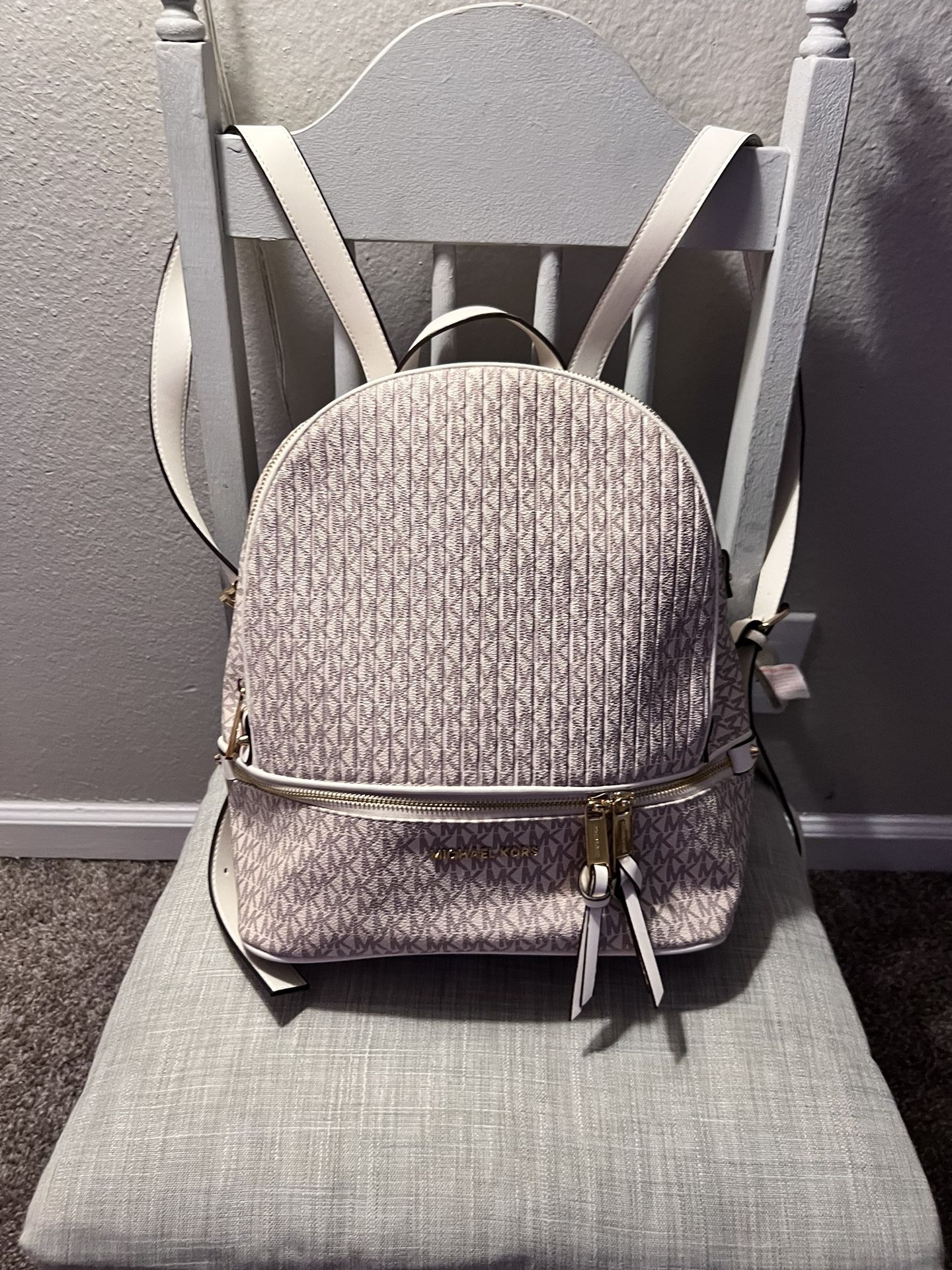Backpack, Michael Kors white and grey monogram Gold accents Good condition Has one small rip on interior that isn’t seen! Soft leather! White