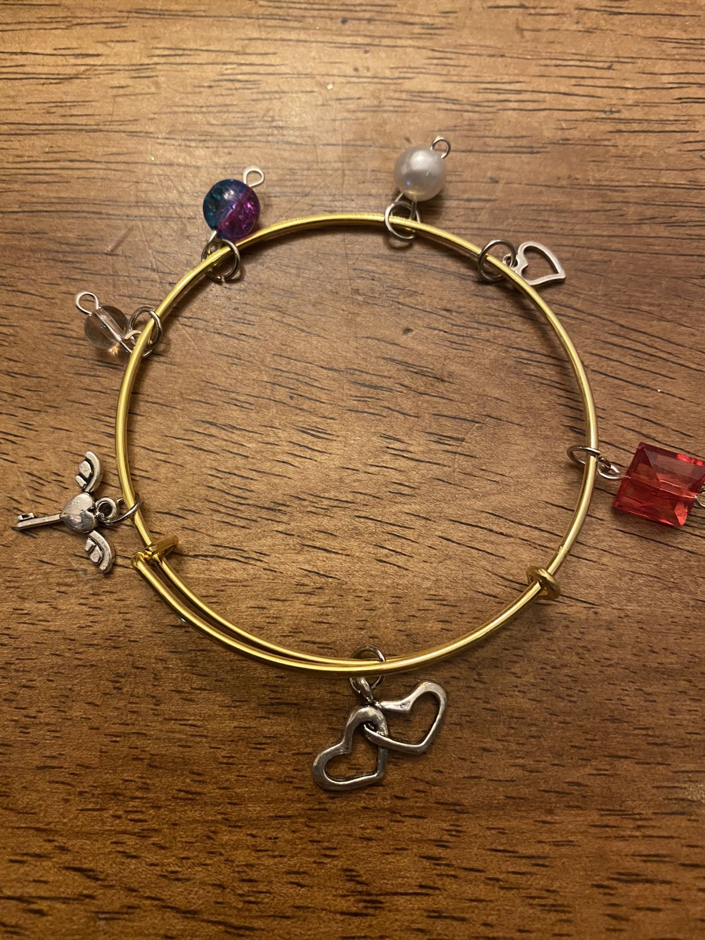 Hand crafted bracelets with beads and charms . 10 dollars each . Bangle bracelet sizes are 2.6 inch squeeze to open.