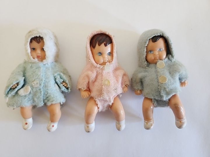 These 3 miniature baby dolls are rubber or vinyl. 2 boys and 1 girl. Two of them, 1 girl and 1 boy, are for sure Shackman dolls, stickers on the back. Made in Hong Kong. The other baby boy does not have the Shackman sticker and looks and feels a little different than the others. All have poseable arms and legs, and need some cleaning. Contact me with any questions.