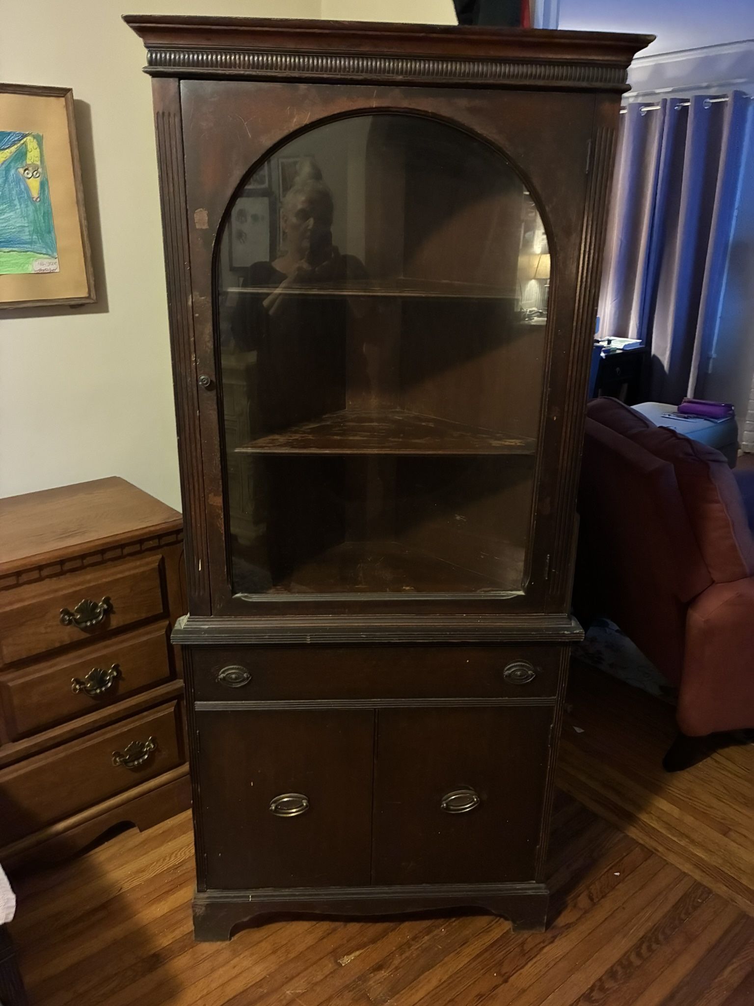 Mahogany, original corner hutch. Class doors, draw. Cabinet. Beautifully detailed. Original finish. Original! Pristine. Been handed down to me in my inheritance. Well loved!