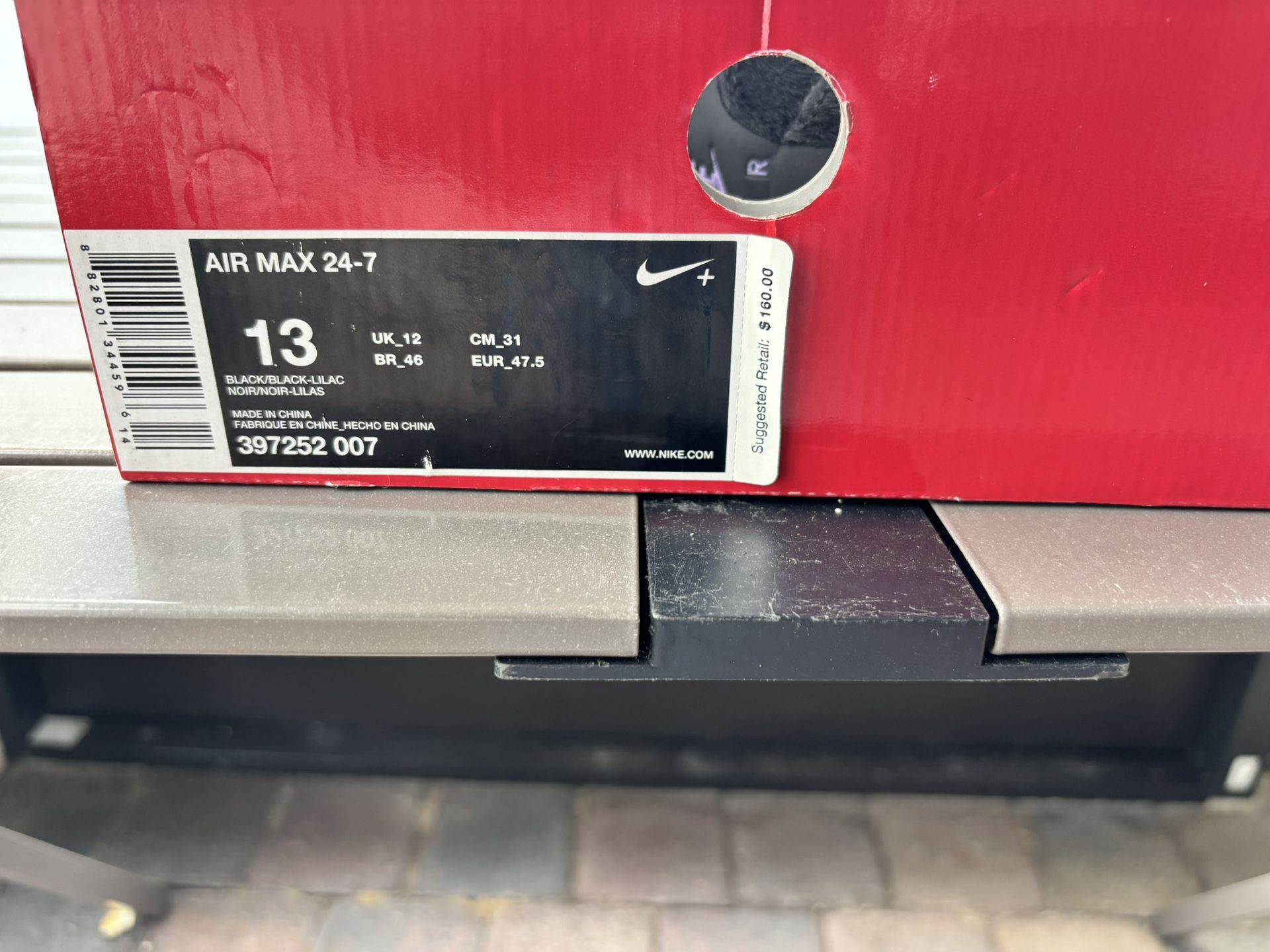 AIR MAX 24-7 COLOR: BLACK/BLACK-LILAC NOIR/NOIR-LILAS MODEL: 397252 007 ***CHECK OUT THE OTHER SNEAKERS I HAVE LISTED. *** THESE SNEAKERS RECEIVED DAMAGE ON THE OUTER SOLES DUE TO A FAULTY CLIMATE CONTROLLED STORAGE UNIT. ***MAKE ME AN OFFER