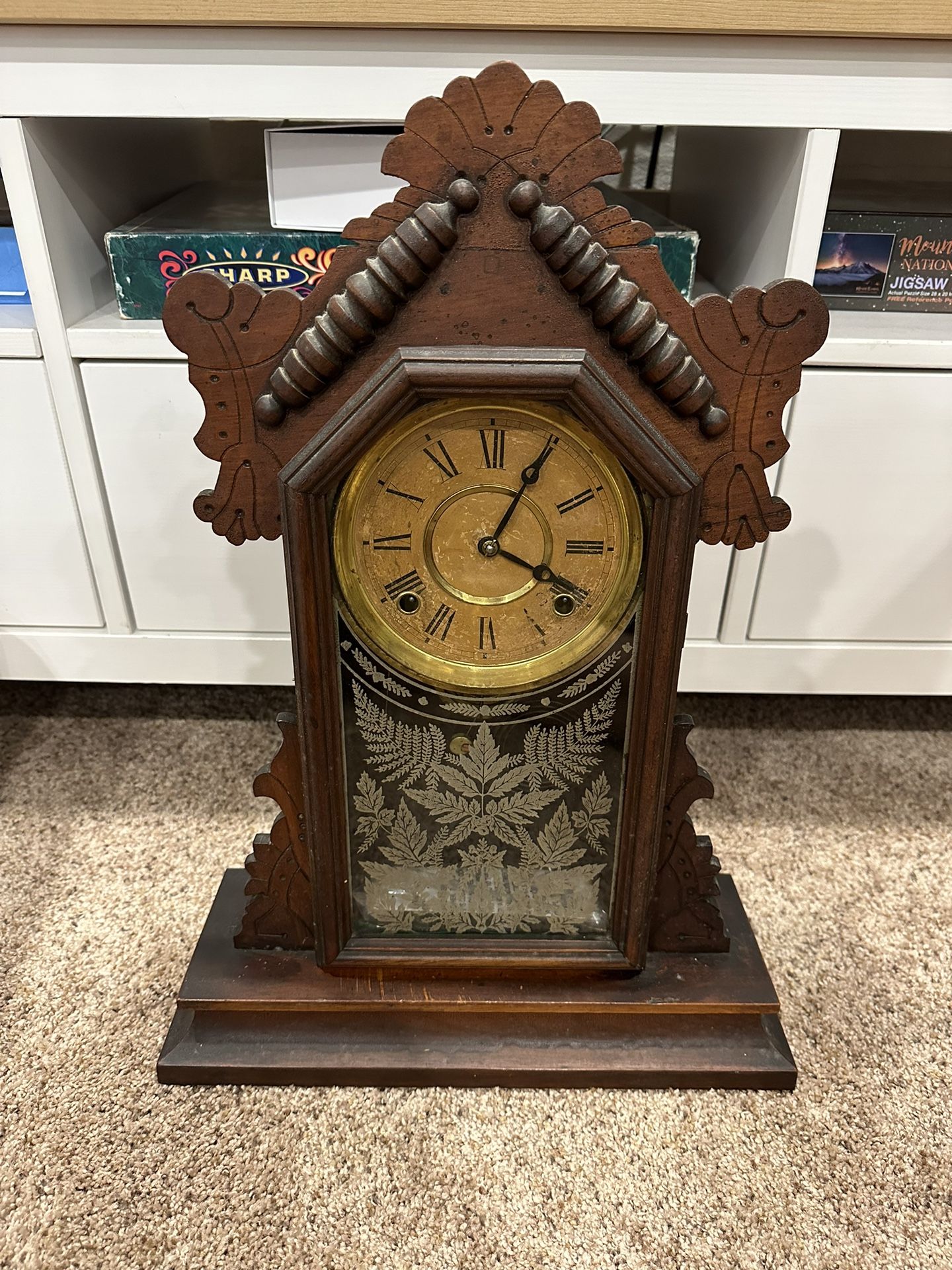 Beautiful antique kitchen clock. Have not tried to wind it up or use it but my grandmother did use it and so it should still work fine. You can see all the parts in the images.
