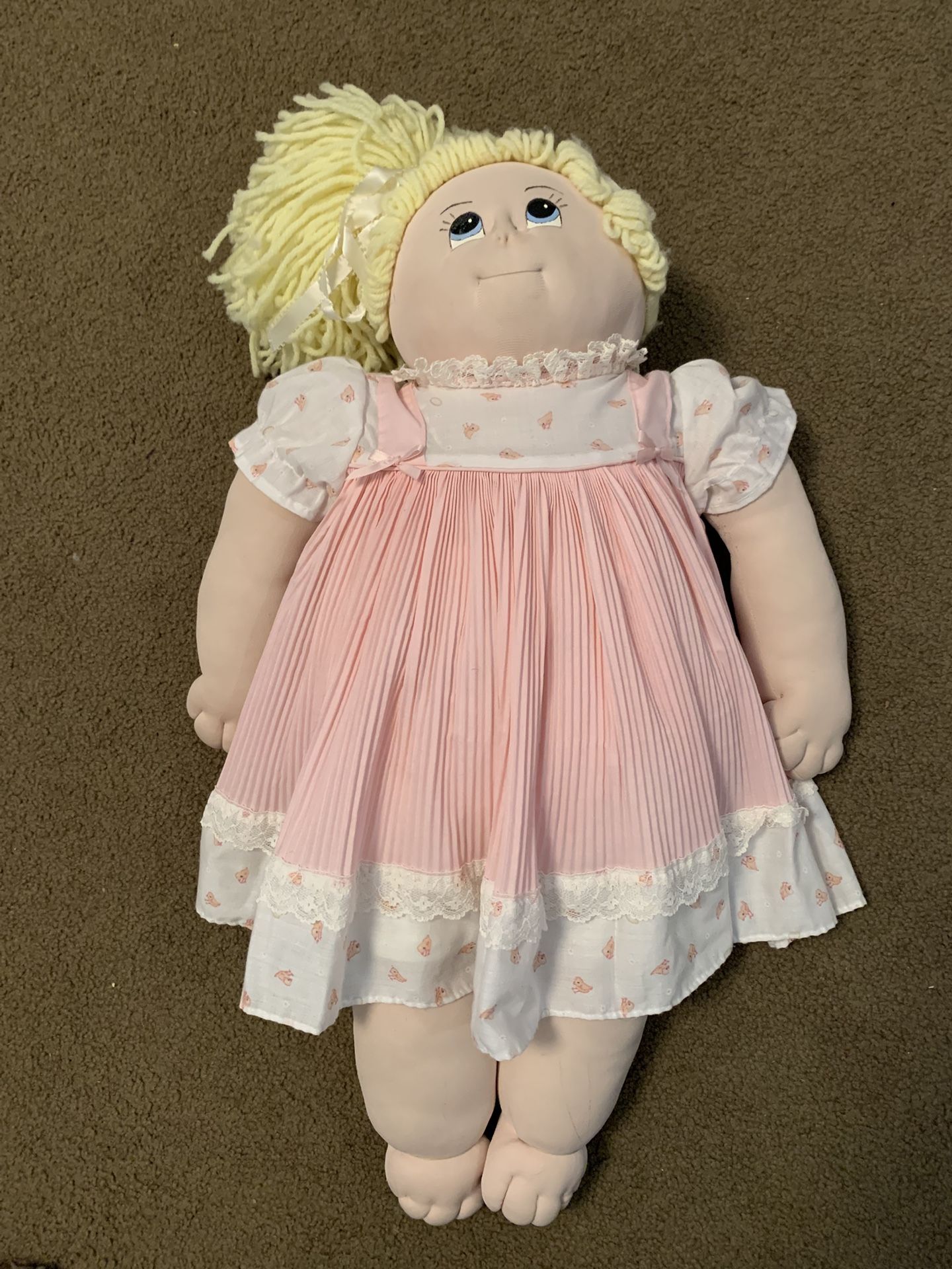 Sweet doll with soft nylon body, yellow yarn side ponytail hair and painted eyes. All her body details - smile, nose, knees, hands, feet, and belly button are made with stitches. Clean with a couple of small runs on one leg. Comes with pink dress and biker shorts. Height is 24 inches. Handmade by “Fran” in 1982.