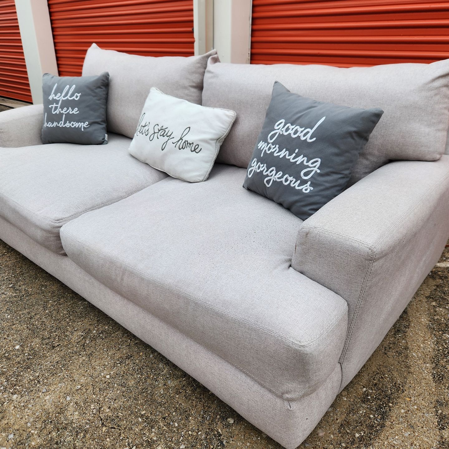 This couch is a year old. It's down filled and so comfortable. It's not so much long but it sits deep. Perfect for tighter spaces. No structural damage. No pet's. Non-smoking home. Your welcome to come see it. 88x44x32.