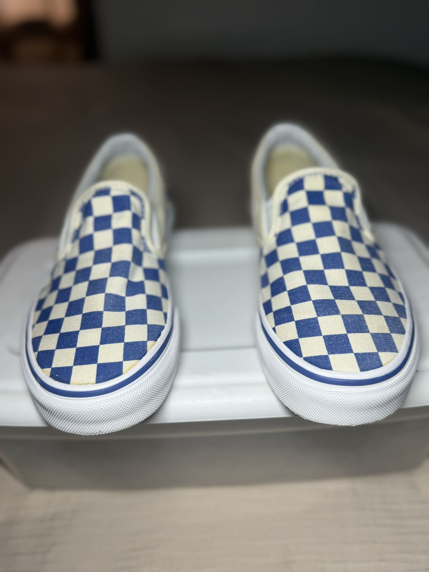 Old Skoo slip on vans , size 5 They are used but in good condition , you can see a bit of the overlapped glue because it’s now a bit yellowed giving their about 7 years old . I do not have the big , if there’s any questions please ask !