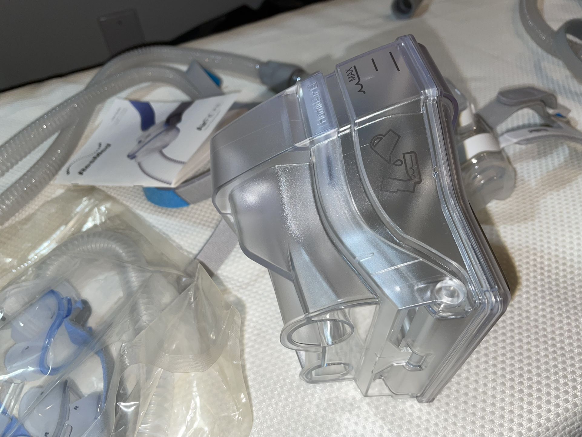 New ResMed Head Gear and mask with multiple nasal pillows still in sealed new packaging and water reservoir with user guide.