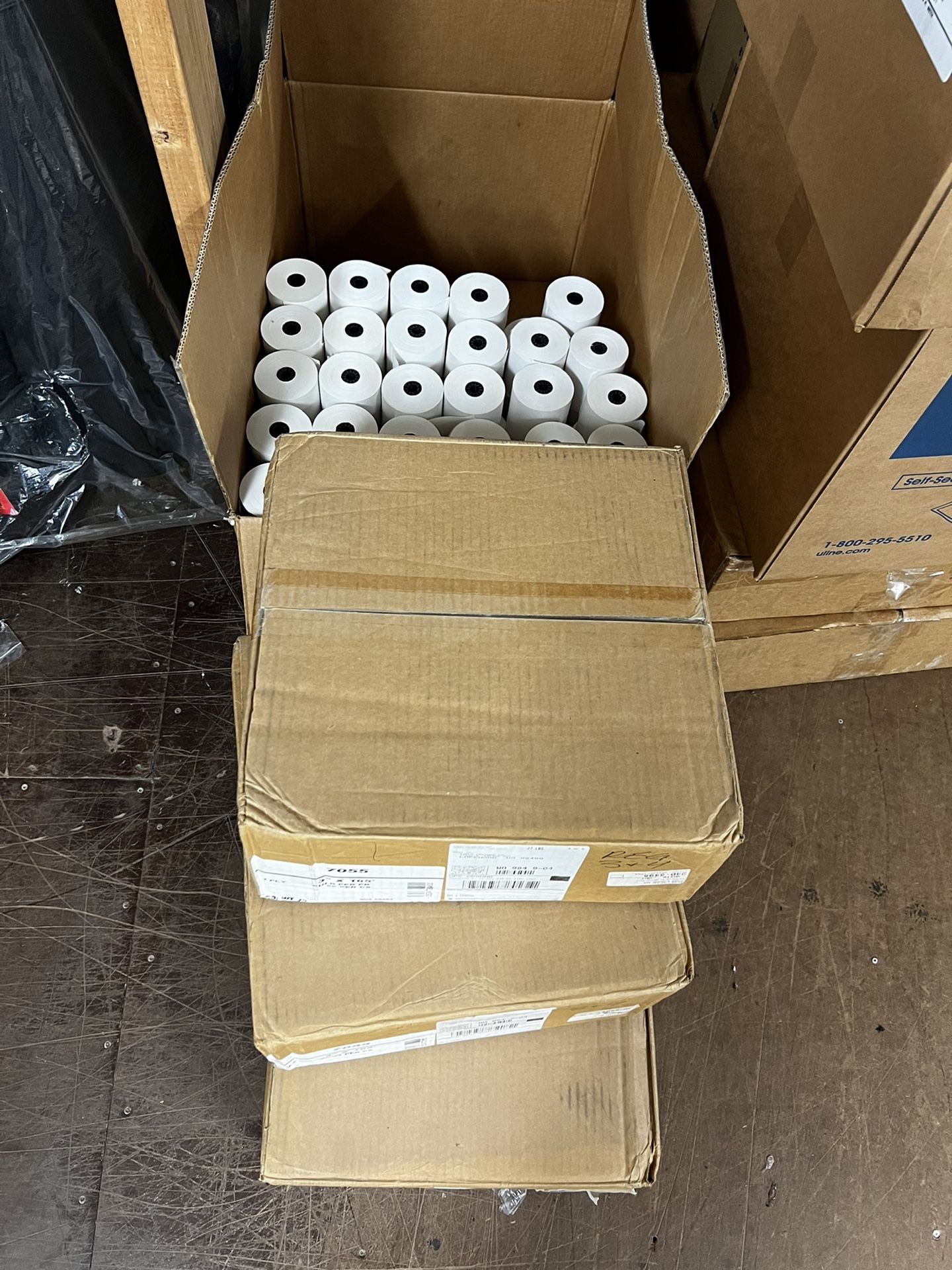 Receipt paper style 7055 from Nashua 3”x165’ 269 rolls total 150 still in unopened original shipping boxes Rest are still unused as shown in first picture. $80 / box of 50 or $400 for all 269 rolls Epsom receipt printers: TMU200B TMU220B TMU375 VeriFone credit card printers: P250 P500 P900 Omni 480