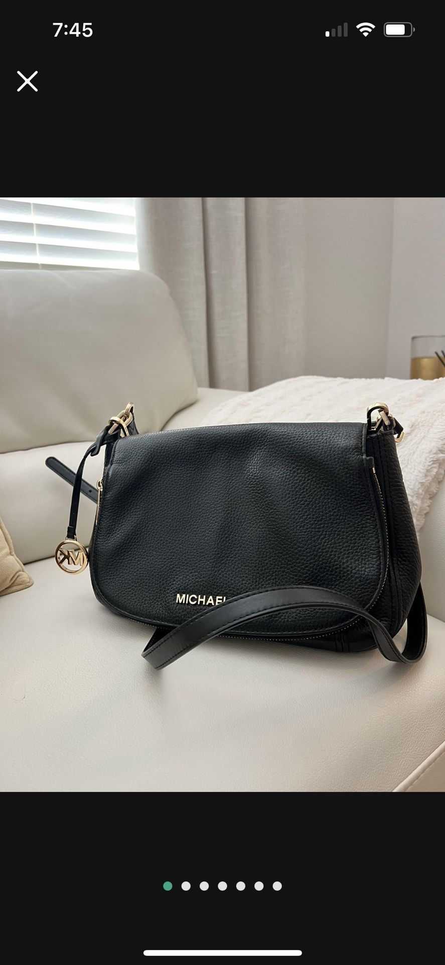 In perfect condition Black leather with gold finish 12 inches wide 9 inches long 4 inches deep Removable strap
