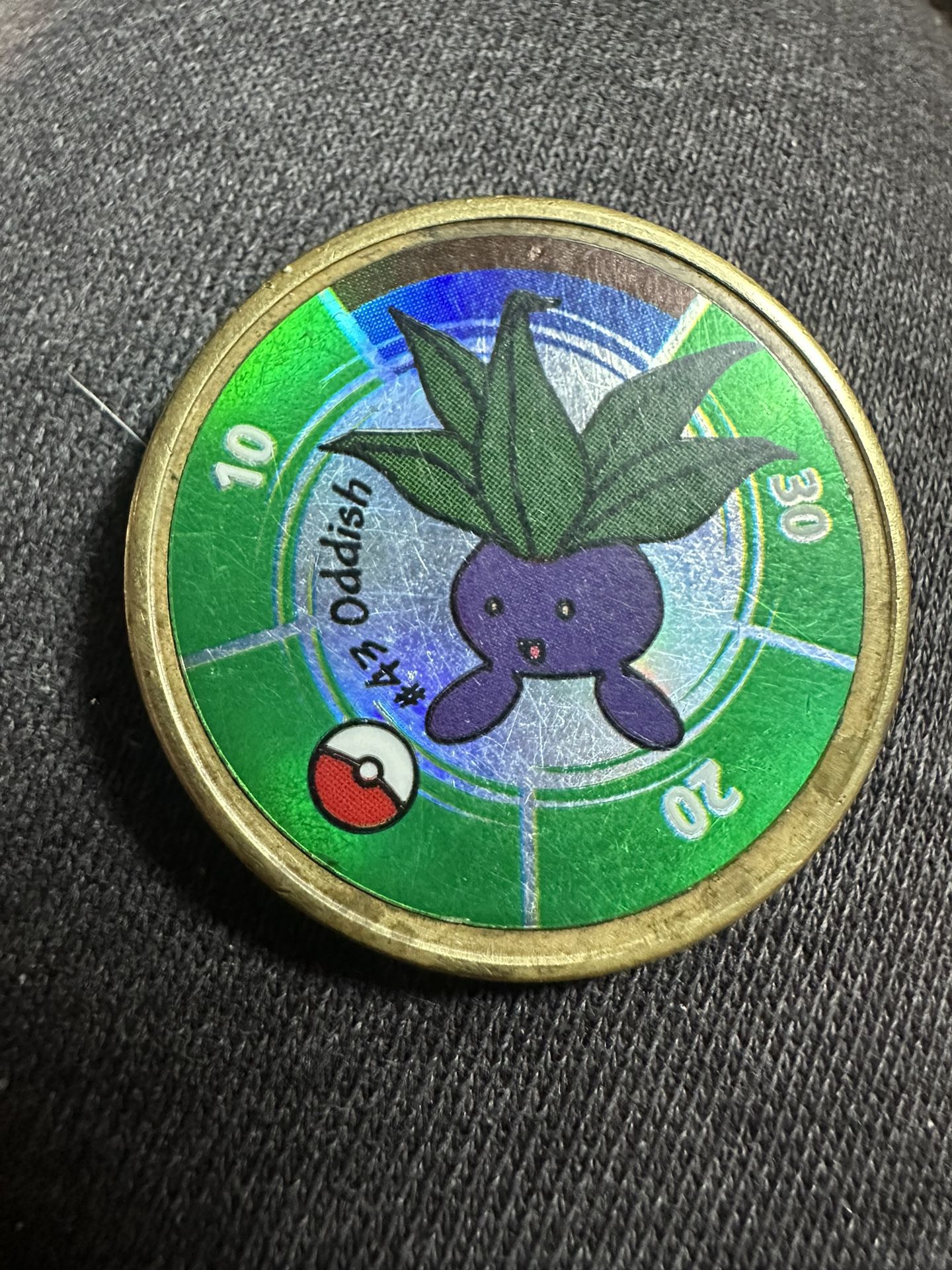 Check out this absolute relic from the late 1900s. You’ve got a vintage Oddish #43 Pokémon Battling Coin, a heavy-hitter from the 1999 collaboration between Hasbro and Nintendo. This isn't just a trinket; it was a core piece of an early tabletop battling game, which is why you see those power stats (10, 20, 30) etched around the rim.